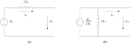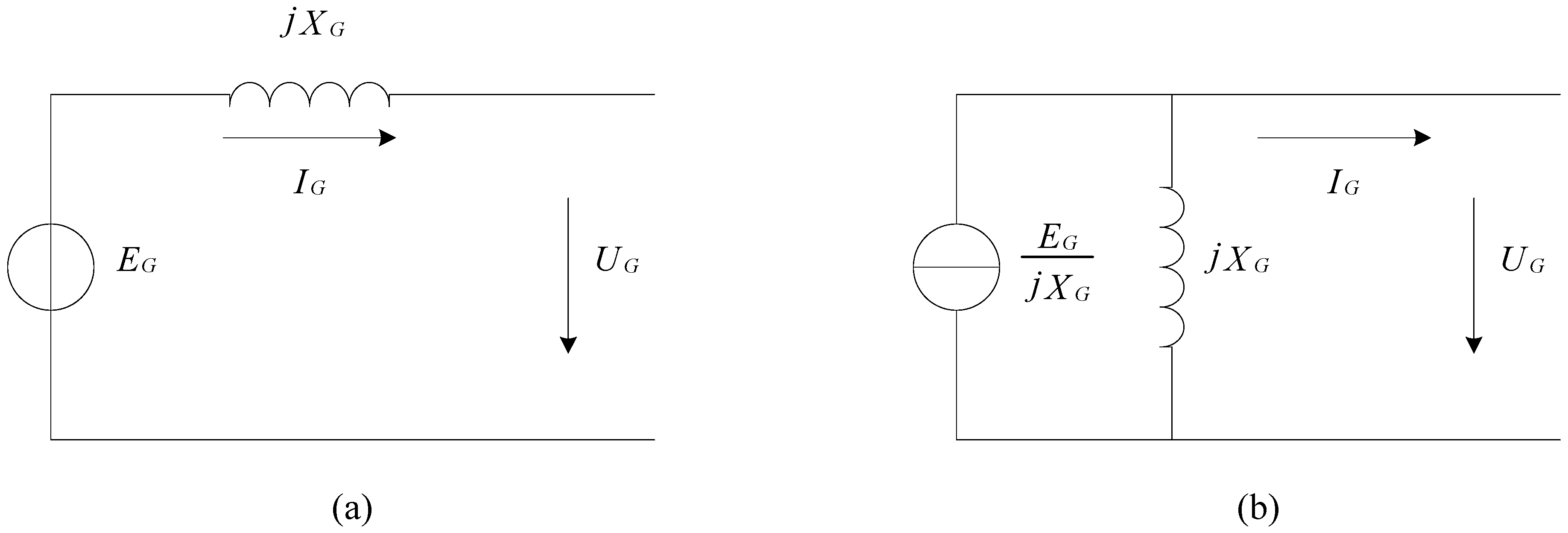 Generators are normally seen in the power system. The equivalent circuit of generators is divided into voltage and current equivalent circuits as shown in Figure 3a and Figure 3b.