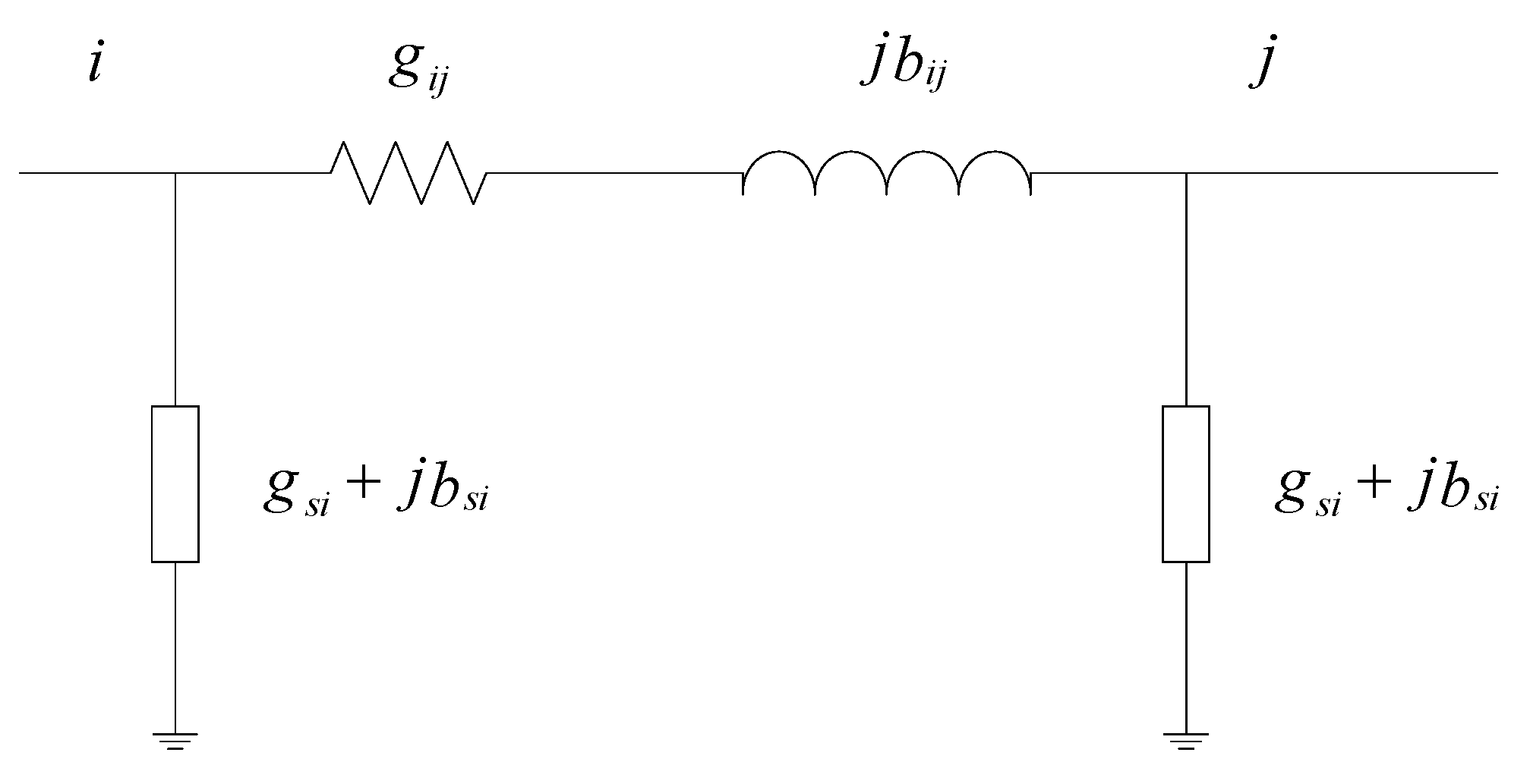 where is the series admittance of branch , is the shunt admittance relative to ground of node , and are respectively the voltage phasors of node and node .