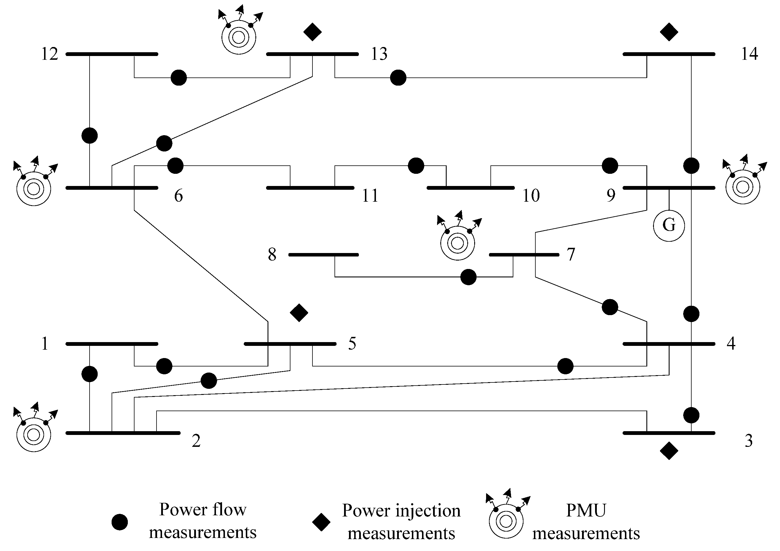(2) Case 2: Power flows in 4–5, 4–7, 4–9, 7–9, 10–11, 12–13 and 13–14. Power injections in buses 3, 5, 13 and 14. PMU measurements in bus 2, 7, and 9.