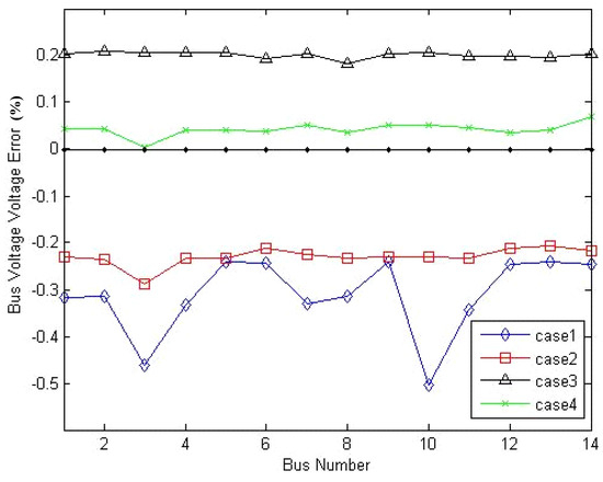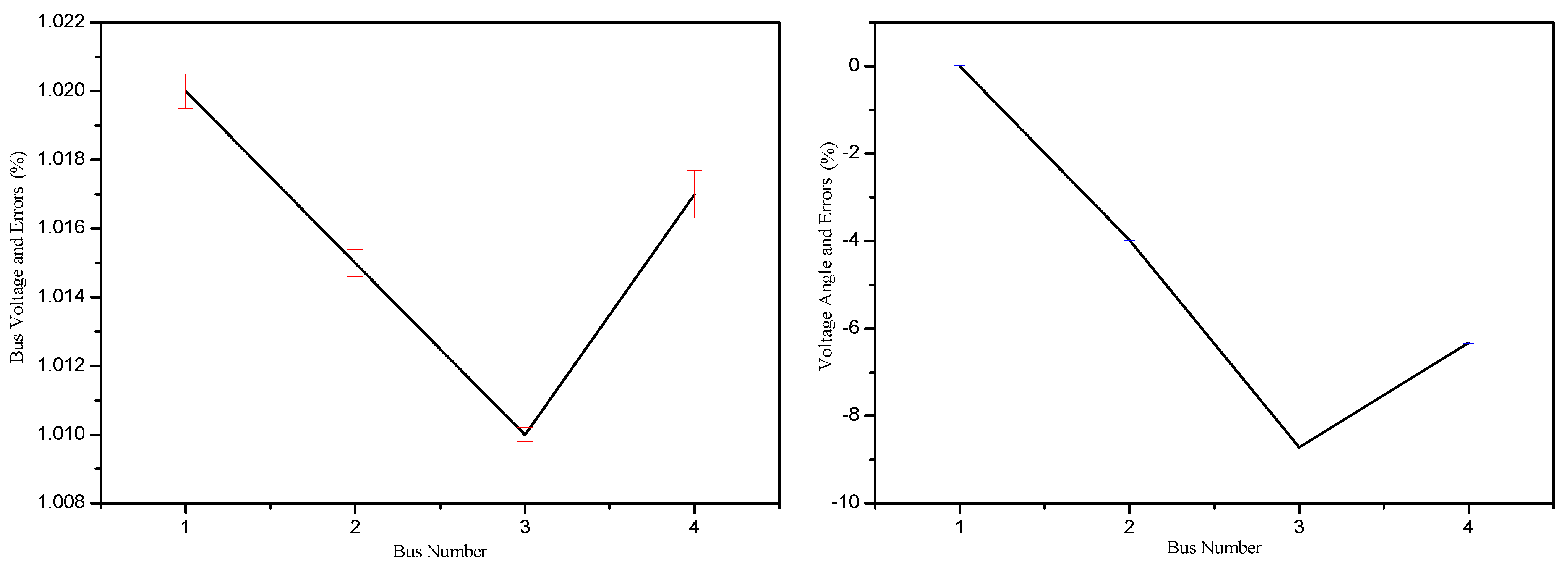 To easily calculate and intuitively display the results, usually it is better to transform the active, reactive power injection measurements and active, reactive power flow to per-unit values. In this paper, we selected the reference value as 100 MW or 100 MVAr to transform the above data to per-unit system, and phase angle’s units are degrees (°). All other measurements’ units are p.u. Assuming the traditional measurements error ranges from 1% to 3%. Measurements from PMUs have a high accuracy, and their amplitude errors are from 0.1% to 1%, and the range of phase angle is from to . Tolerance to converge is set to , meaning that if there is: