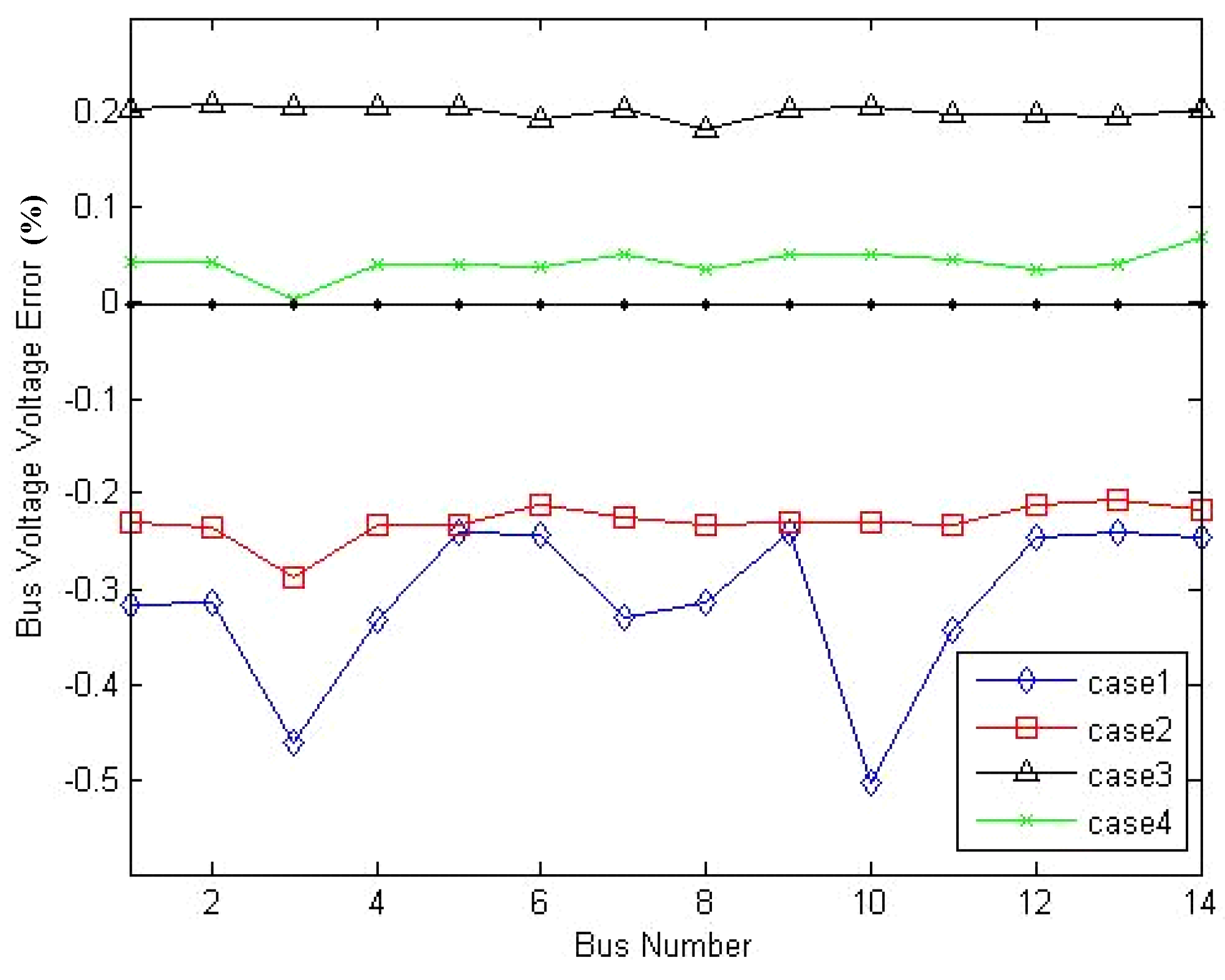 (1) Case 1: just includes traditional measurements. Power flows in 1–2, 1–5, 2–5, 3–4, 4–5, 4–7, 4–9, 6–11, 6–12, 6–13, 7–8, 7–9, 9–10, 9–14, 10–11, 12–13 and 13–14. Power injections in buses 3, 5, 13 and 14. Voltage amplitude in bus 1.