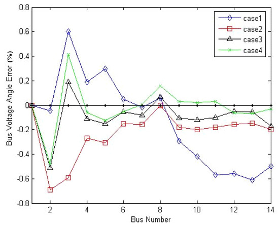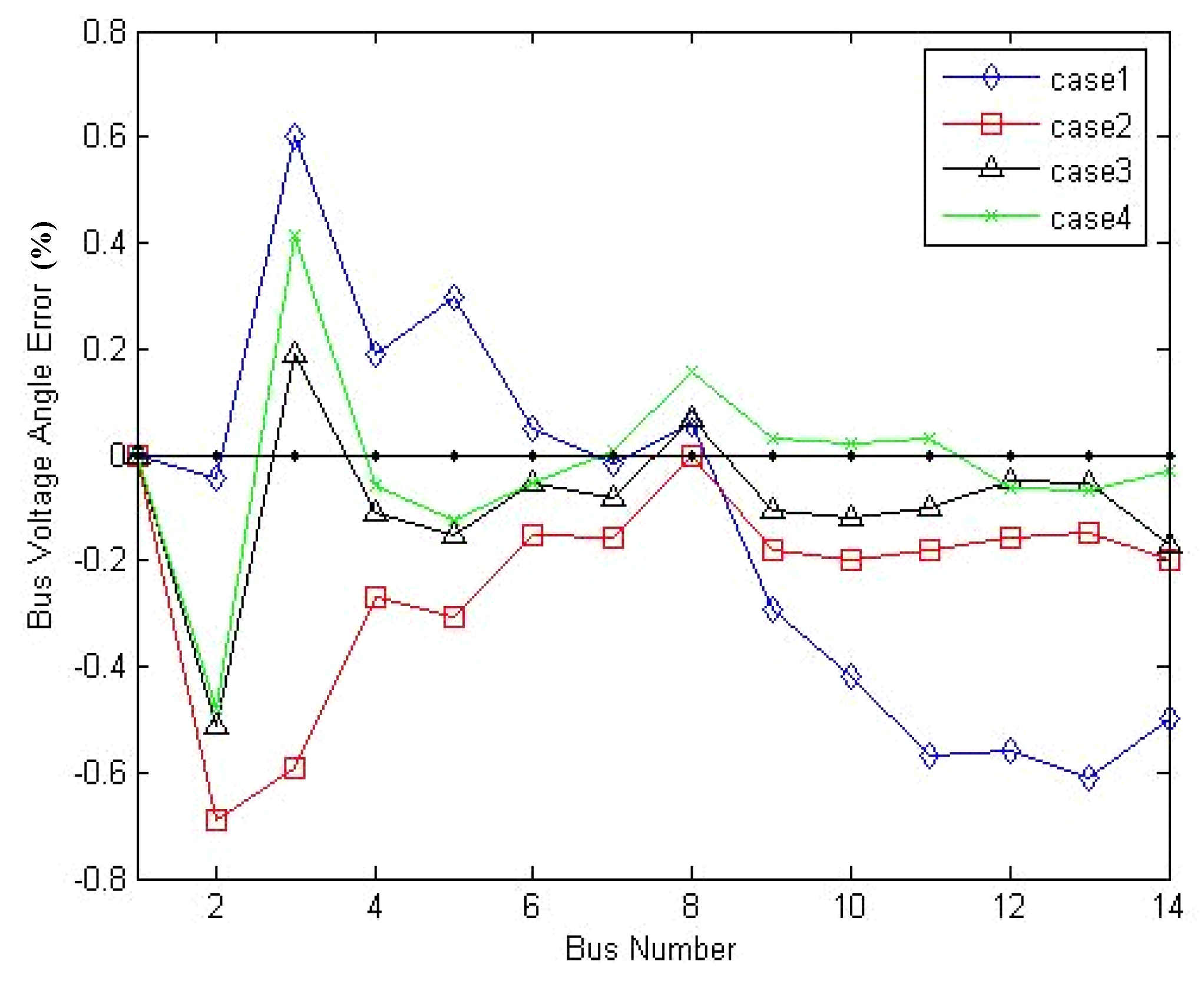 Figure 7 and Figure 8 are the bus voltage amplitude and angle estimate errors using the data from Table 1 and Table 2. From the figure, we can see that case 1 has the worst state estimation effect and case 4 has the best estimation effect. This shows that when adding PMU data to conventional SCADA measurement inputs, the state estimator will improve its convergence speed and accuracy.
