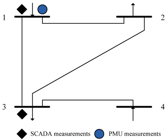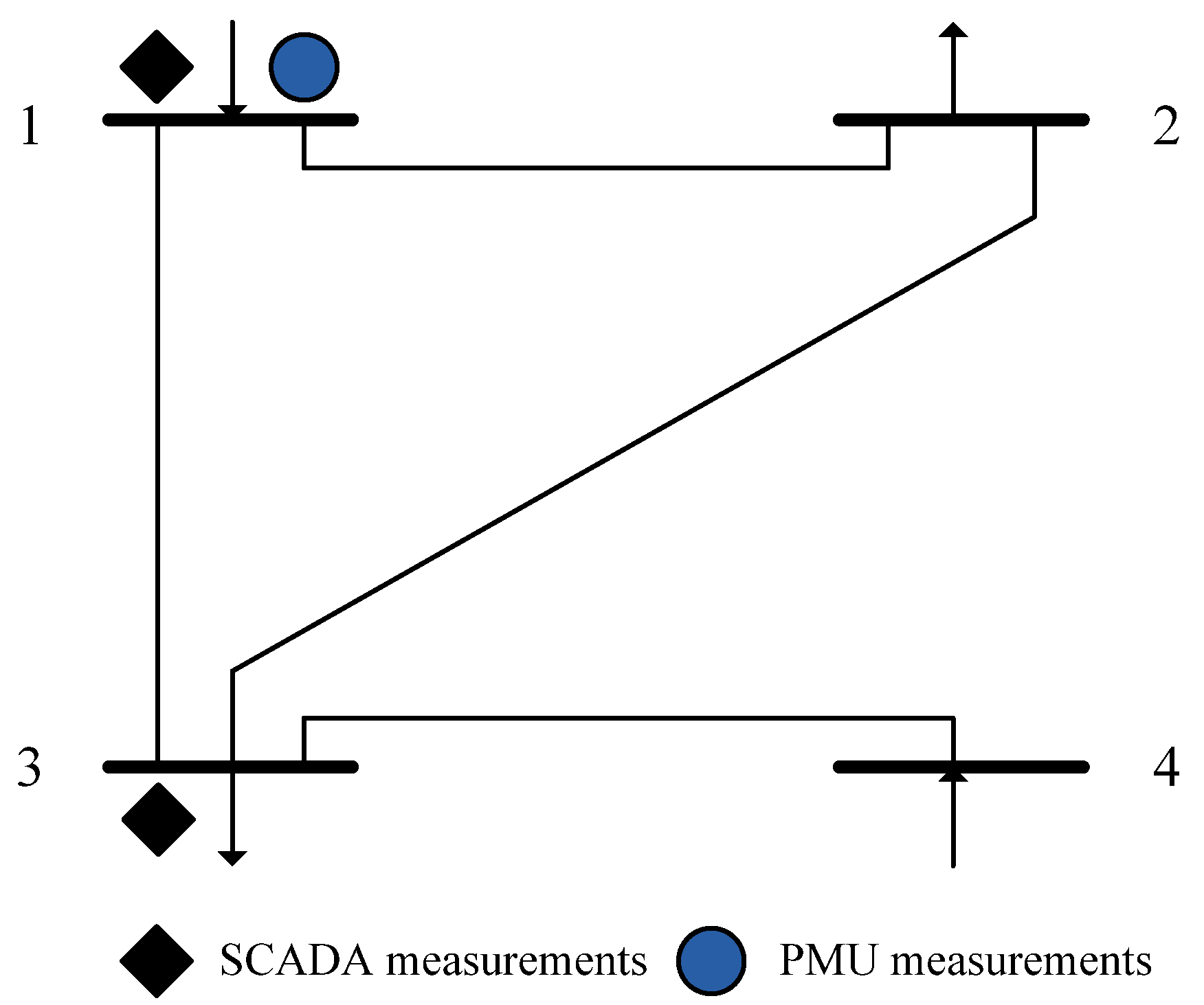 The proposed robust WLS method was implemented on a four-node experiment test system as shown in Figure 9. PSCAD is used to simulate the power system parameters such as active power, reactive power, etc. The simulated results of PSCAD are imported to a RTDS system. SCADA measurements are arranged in bus 1 and bus 3. As we know, due to the lack of a reliable real-time scale between test results of different locations, SCADA monitoring data is valid only in the local system, and it is difficult to detect and analyze the dynamic state of an entire power system just with SCADA, so we also used one PMU in the experiment, which is set to bus 1.
