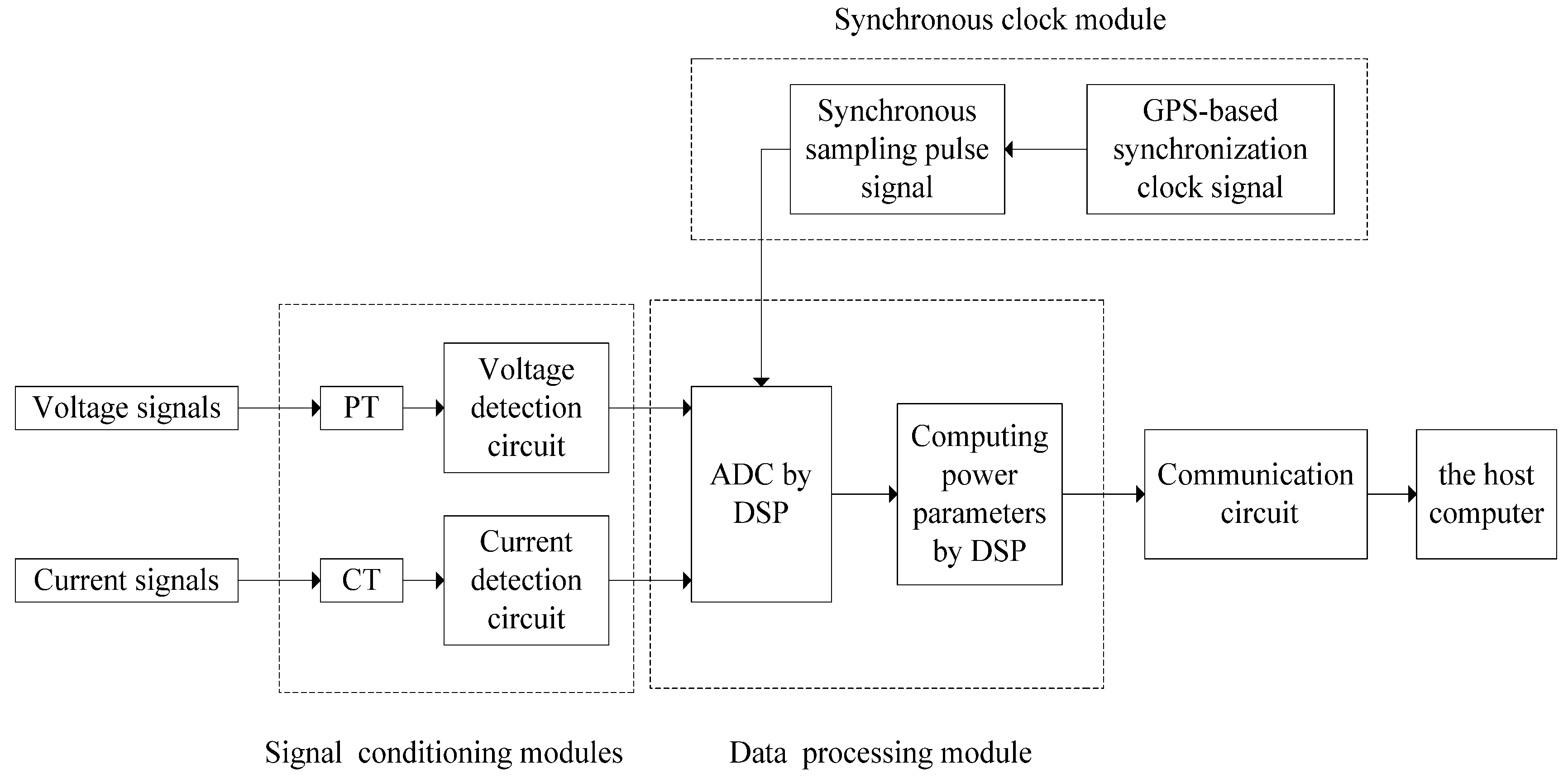 Figure 10 is hardware design structure of the PMU used in the experiments. PMUs consist of signal conditioning modules, a synchronous clock module, data processing module and communication circuit. Signal conditioning modules consist of PT, CT and v detection circuits (PT uses SPT204A; CT uses SCT254AK). They convert analog signals of the power network into electrical signals which can be sampled and are suitable for ADC. Through DSP the data processing modules convert analog signals to digital signals. The synchronous clock module tracks synchronous 1PPS from the GPS, and generates trigger DSP synchronous sampling pulse signals. Power parameters such as phase angle, frequency, and voltage will be uploaded to the host computer via the communication circuit.