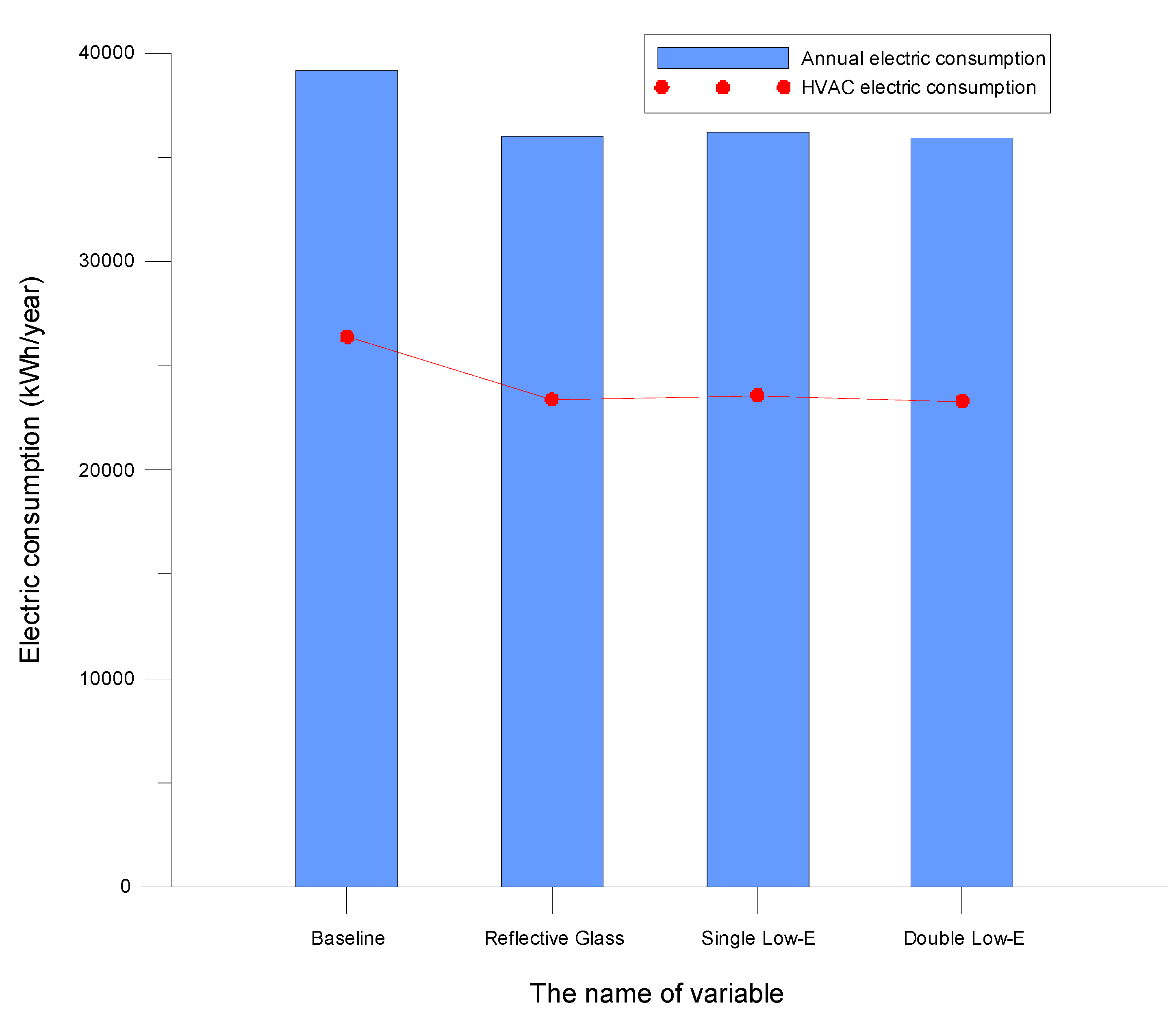 11] installed a distributed generation system in four types of commercial buildings in California and applied eQUEST to conduct a simulation-based analysis. The variables in the analysis included the shading design for windows, lighting control, HVAC efficiency enhancement and cooling capacity enhancement. The results showed that the range of savings for commercial buildings can reach 5%–20%. Yu