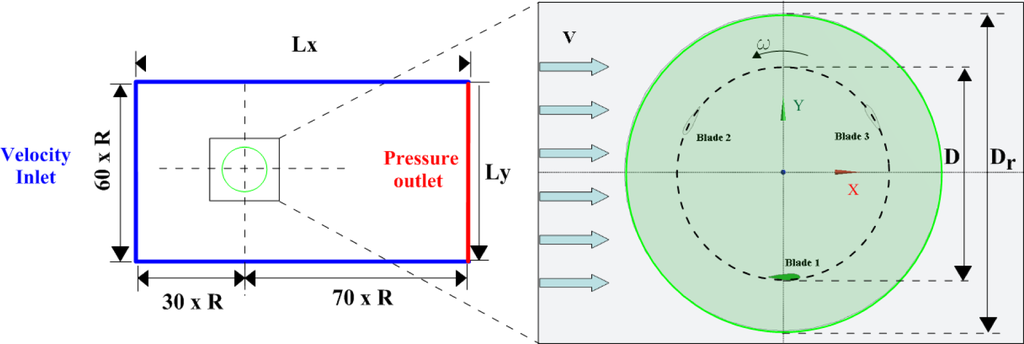 In this section, the geometrical features of the analyzed Darrieus turbine are described first. Then, the adopted control volumes and the corresponding boundary conditions are described. The mesh generation parameters are also given. The solid geometry was created with a CAD modeler and imported into a “Mesh Component Systems” in ANSYS® Workbench™, to create the mesh model. The discretized model generated was then read into FLUENT® for numerical solution. The geometric characteristics for the turbine are a NACA 0021 blade airfoil, with a chord length c = 0.3 m and a rotor radius R = 0.99 m. The length of the control volume along the free-stream direction is equal to Lx = 100 R, while its width in the y direction is Ly = 60 R. The circular rotating domain has an overall diameter of Dr = 3 m; see Figure 1. At the velocity inlet, the velocity distribution is uniform, directed along the x-axis and equal to 7 m/s. The pressure outlet is set equal to 101,325 Pa. The no slip boundary condition is applied on the turbine wall blades. An interface wall is introduce between the fixed and rotating domain. The origin of the reference frame is the center of the rotor.