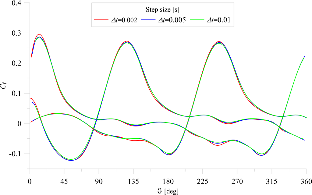 In order to define the time step size for three-dimensional simulations, Equations (3) and (4) are invoked for a rotational speed of 60 RPM resulting in Δt = 0.0017 s and Δt = 0.03 s, respectively. Three different values of step sizes are selected, namely Δt = 0.002, 0.005, 0.01 s. The performance characteristics for the selected time step size are thus investigated. From the results shown in Figure 11, it can be seen that time step equal to 0.01 s allows one to obtain matching results with the finer step sizes. Moreover, the choice of Δt = 0.01 s allows one to reduce the calculation time considerably.