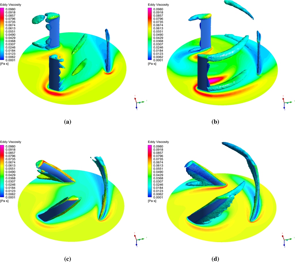 For the sake of completeness and to better highlight this effect, the vortex core regions are shown in Figure 14. It appears that as the rotational speed increases, vortex core regions extend more and more, influencing the upcoming blade. This phenomenon is more evident in the Straight blade geometry (Figure 14), where vortices accumulate mainly at blade tips. On the contrary, in the Helical blade geometry, vortices are evenly distributed along the blade trailing edges. Considering a three-dimensional blade, the Helical blade has a smoother behavior with respect to the Straight blade; as shown in Figure 13, the maximum value of Ct(θ) is obtained at about the same azimuthal position. This effect reduces with the increase of the angular velocity.