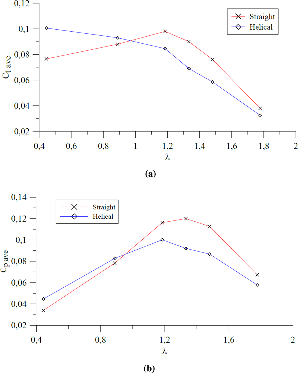 At low rotational speed, the average Ctave for the helical blade turbine is higher with respect to the straight blade up to λ = 1, where the curves intersect. The straight blade configuration produces higher Ctave as the rotational speed increases beyond this value. In accordance with static results for the given conditions, the helical turbine shows a lower cut-in speed.