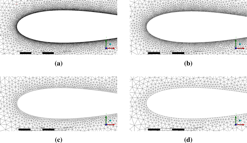 Figure 2. Mesh discretization along the two-dimensional turbine blade airfoils. (a) Mesh 0; (b) Mesh 1; (c) Mesh 2; (d) Mesh 3.