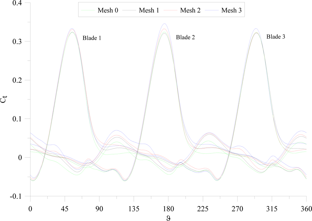The influence of discretization is assessed by investigating the effect of the characteristics of the maximum element length close to the airfoil on the torque coefficients Ct. More particularly, it appears from Figure 3 that the torque coefficient for the three blades is only slightly affected by the chosen mesh size values, as well as by the y+ (see [30], page 109), which is lower then 10 for Mesh 0, Mesh 1 and Mesh 2.
