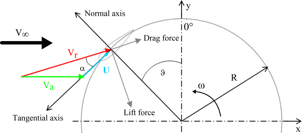 In order to compute the lift and drag coefficients of the blade airfoil, the angle of attack has to be considered, and it is directly computed by the CFD analysis. Taking into account Figure 4, it appears that the angle of attack α is the angle between the airfoil cord and the relative velocity Vr. The relative velocity Vr of the air mass deflected by the airfoils is given by the vectorial composition of the wind velocity Va with the tangential relative velocity U = −ω R.