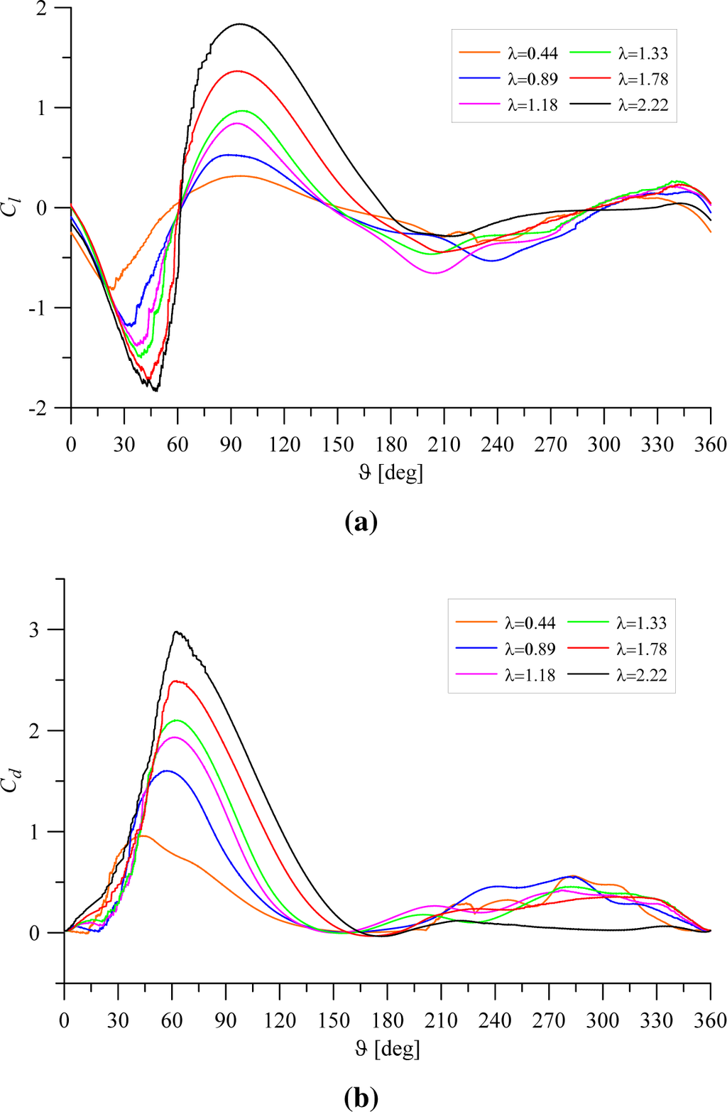 The lift and drag coefficients’ variation with respect to azimuthal position are reported for different values of the tip speed ratio in Figure 5. It is seen that as the λ increases, both the maximum absolute value of the lift and drag coefficients produced by airfoil increase.