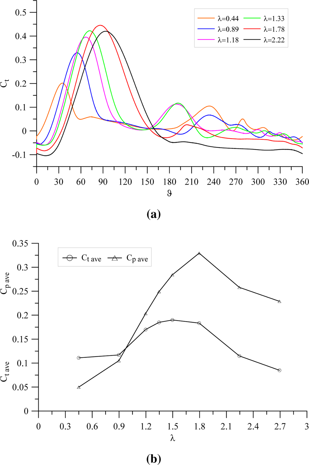 Figure 6. Torque and power coefficients as a function of azimuthal position and λ. (a) Instantaneous torque coefficient (Ct) for a single blade with respect to the azimuthal position (θ) at various tip speed ratios (λ); (b) rotor average torque coefficient (Ct) and average power coefficient (Cp) with respect to tip speed ratio (λ).