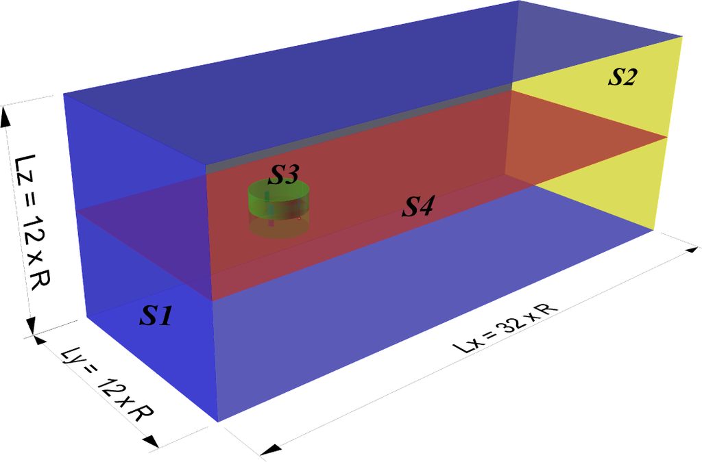 The length of the control volume along the free-stream direction is equal to Lx = 32 R, while its width in the y and z direction is Ly = Lz = 12 R; see Figure 8. The origin of the reference frame is set on the center of the rotor, 8 m from the inlet. The boundary conditions are defined as a velocity inlet on surface S1 in Figure 8; the inflow velocity is directed along the x axis only and equals 7 m/s. Surface S2 is set as a pressure outlet, keeping the pressure constant equal to 101,325 Pa. In Figure 8, surface S3 is the interface between the rotating and the fixed volumes. The no slip boundary condition is applied on the turbine wall blades. The rotational speed of the turbines, for the sake of dynamic analyses, ranges from 30 RPM to 120 RPM. The origin of the reference frame is the center of the rotor; on surface S4 in Figure 8.