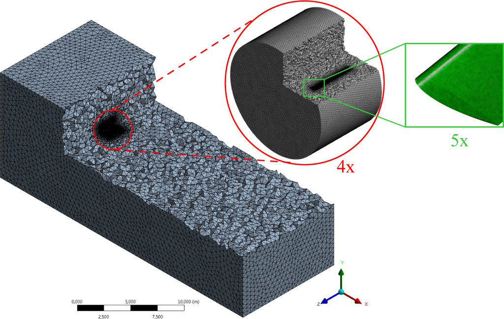 The mesh is characterized by tetrahedral elements. In particular, the maximum element size for the fixed domain is set to 0.5 m; the length of the element at the interface is equal to 0.05 m, whereas the minimum element size is 0.003 m and is used to discretize the fluid domain on the turbine wall; see Figure 9. The number of elements and nodes for the three-dimensional mesh are given in Table 3.