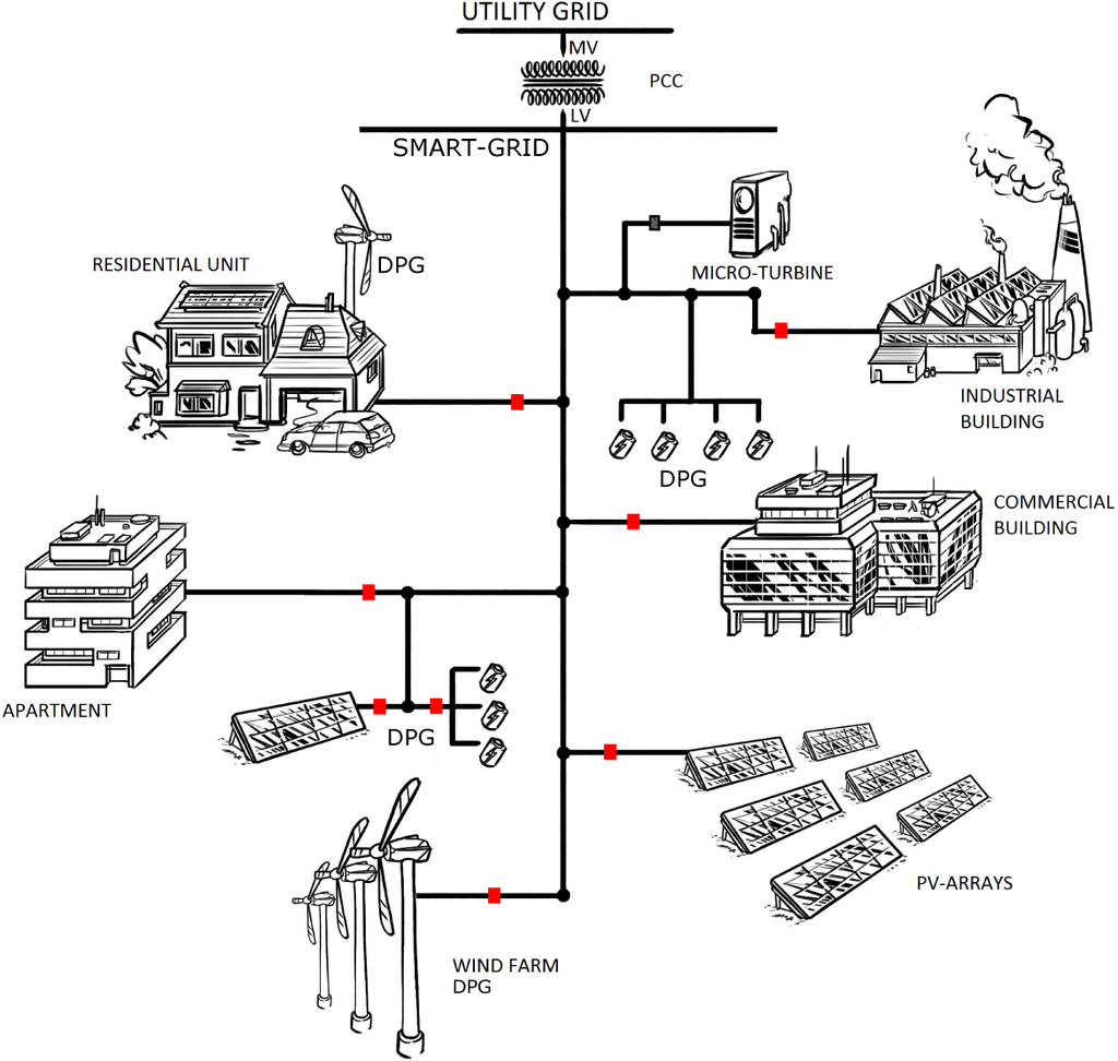 With the power control being increasingly decentralized, we consider the case of an area where power routers can be installed in every house or commercial facility, as shown in Figure 1. The utility-grid is linked to the smart-grid through the point of common coupling (PCC) with various loads and decentralized power generators (DPG) distributed throughout the latter smart-grid. The introduction of power routers, represented by the red blocks, enables the partitioning of the smart-grid into smaller segments, called micro-grids.
