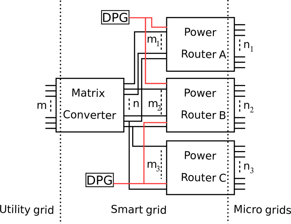 Power routers, which can be distributed according to the load-demand, can perform switching to connect particular loads with the desired input sources. We assume the routers and matrix converters to have m inputs and n outputs, as shown in Figure 2. The matrix converter receives the input phases from the utility-grid and outputs them to the power routers installed on the smart-grid which may also receive power from DPGs. One or more routers together can form a micro-grid according to the localized control system needs. This study considers the most common case scenario of a three-phase system. Therefore, we will scale down our experiments to only three-phases. It can be understood from Figure 2 that the power routers can form a power network that will be consisted not only from power utilities but also from information ones. This can also be described as a next step towards the so-called Enernet [28,29], where the electrical power (i.e., electrical energy) can coexist with the information (i.e., internet, communications, etc.) [30]. Another important part is to distinguish the roles of matrix converter and power router. Matrix converters have the ability to replace the bulk transformers by offering active control of the point of common coupling. That is the main reason a matrix converter is used in this experimental work. On the other hand, the main focus is on power line switching with the aid of power routers.