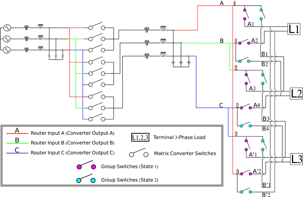 The initial stage of a power router has already been developed for DC applications [3] where the power is transferred on demand from the desired source to the desired load. This is now expanded to include AC applications [4,5] with circuit switching of two power lines and multiple routers in both parallel and series configurations, i.e., an AC power routing network system can be created. The purpose of this project is to create a power network that can be readily adapted to the existing one, and can ultimately provide better regulation, distribution, and transmission of power. Power packet dispatching systems [6] and intelligent power switches [7,8] have also been investigated for the purpose of improved power delivery. The feasibility of the power router requires further testing for practical applications; however, this study is aimed at demonstrating the feasibility of power router switching in three-phase systems. Such a system is investigated in this work because three-phase systems are commonly used in the majority of power-grids.