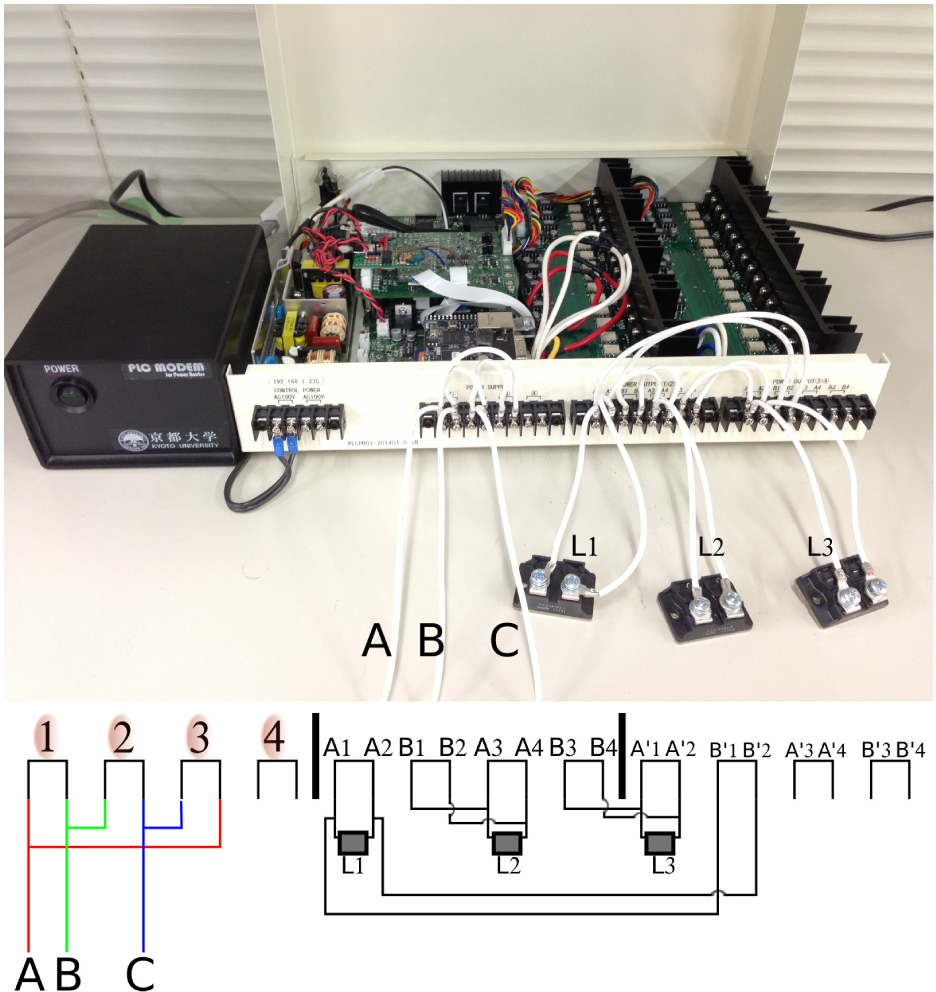 As it was mentioned before, smart power distribution, circuit switching, and constant power delivery to the desired loads are very challenging and important tasks. Ideally, all loads should have the capability of being fed with power from more than one input source. This basic switching scenario is also shown in Figure 3. The switches of the power router are separated into two groups. At first, the purple switches are on, and state 1 is set to the output. State 2 is set according to Table 1 during which the blue switches are on after the moment of switching. The loads are always fed with power but from different sources after the switching. The experimental prototype power router is shown in Figure 4. The line connections of the power cables are also schematically presented. Power router has four inputs and eight outputs and each input can be programmed to be outputted at one of its equivalent two outputs. Power line communication (PLC), which is the black box in the photograph, is used for controlling the power router through a personal computer. As Figure 4 shows, a power router input is considered to be a matrix converter output phase-to-phase voltage. When switching is performed such that a line is considered to fail, the equivalent phase-to-phase voltage is not reproduced at the output of the power router.
