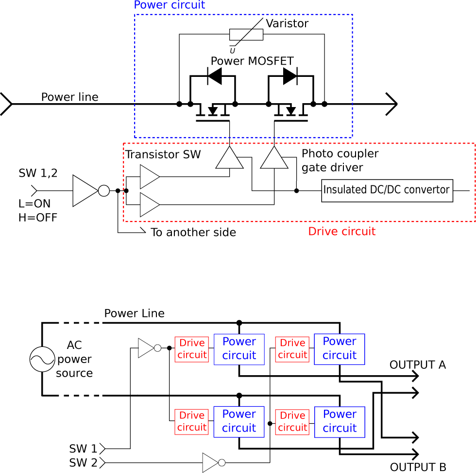 The power router specifications are a maximum operating voltage of 100–200 Vrms, continuous maximum power of 1 kW, and with Si-MOSFETs implemented as switches (450 V, 17 A). Increase of maximum power can be succeeded by implementing wide-bandgap SiC devices and such power routers are under development by our research group. Every ideal switch has to be implemented with the combination of two power MOSFETs. An insight figure of the power router is shown at Figure 5. How a single input phase can be transmitted to either of the two possible outputs is shown in the low part of the figure. Four bidirectional switches with their equivalent drive circuits are the main parts of the system. On the top, one of the bidirectional switches with its control circuit is graphically represented. It is obvious that the two MOSFETs have their sources connected so that only one drive circuit is sufficient. A photocoupler is the main responsible circuit for the bidirectional switch control. The combination of output ports among the different switch circuit units realises the circuit switching function of the power router. The design of the power router has scalability since the change of the number of switching circuit units does not affect the generality of the function. The following experimental results, although performed in test level voltages, can be scaled to higher voltage setup when the device ratings and power capacities are increased.