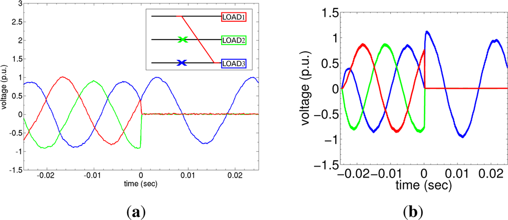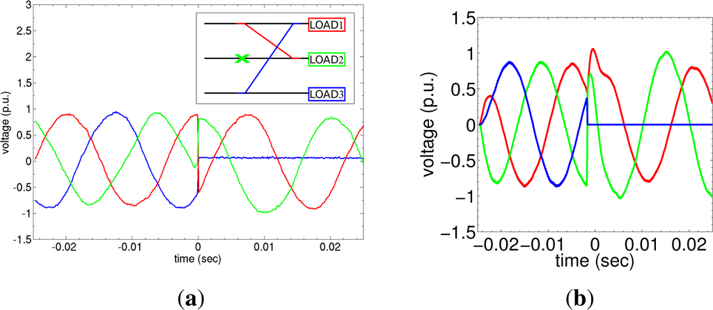 In the beginning, the scenario discussed in the previous section will be presented. It is a three-phase switching during which all the loads are connected to different inputs. In particular, Table 1 shows load 1 which is initially connected to phase AB, but after switching it is connected to phase CA. Load 2 switches from BC to AB, and load three switches from CA to BC. The experimental results are shown in Figure 6a. In the small circuit diagram, the colored lines indicate the line connections after switching and refer to the phase-to-phase voltages. The experimental result is also confirmed from the simulations in Figure 6b. If the practical system is considered (medium level voltage at 6.6 kV and low level voltage at 100 V) then 1 p.u. corresponds to 100 V. The simulations are generated from a Simulink Matlab model based on Figure 3.