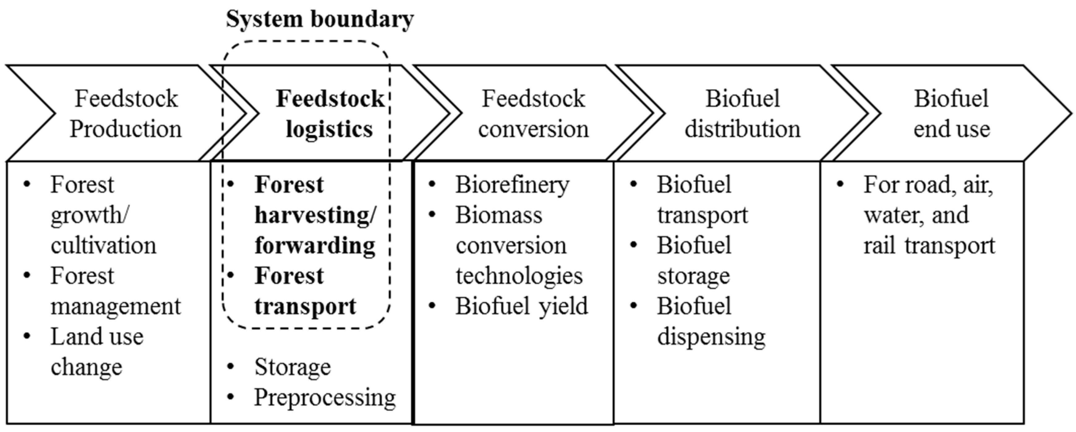 Diagram of system boundary for life-cycle assessment of the forest biomass supply chain.