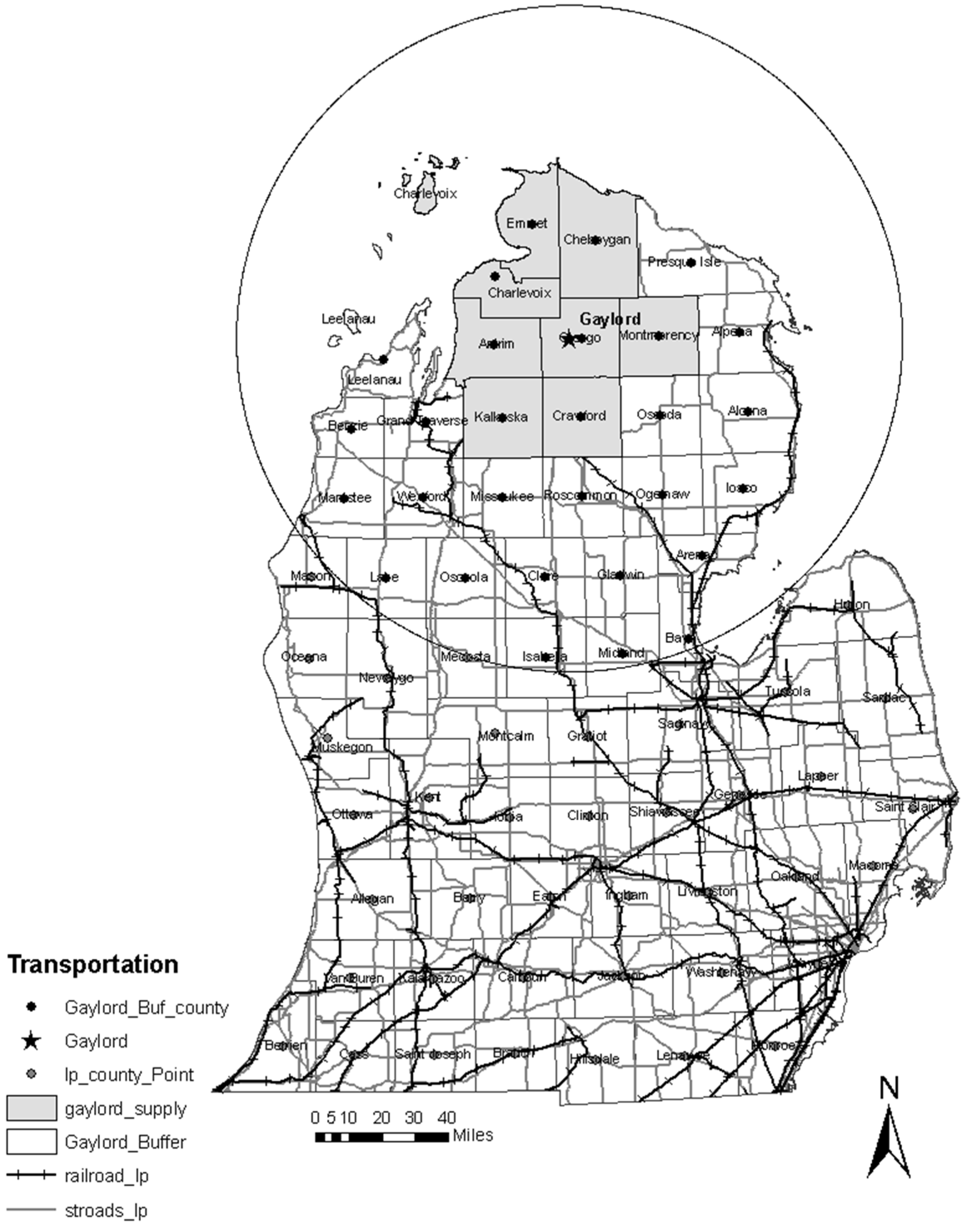 In Figure 2, the Upper Peninsula of Michigan (the U.P.) is excluded because it is assumed that all forest feedstock in the U.P. is not available for transport over the Mackinaw Bridge and will be consumed by others in the U.P. The assumption was made based on the knowledge of a biofuel facility to be constructed in the Township of Kinross in Michigan’s eastern Upper Peninsula. The biofuel facility will use woody biomass as feedstock to produce up to 151 ML (40 million gallons) of ethanol per year.