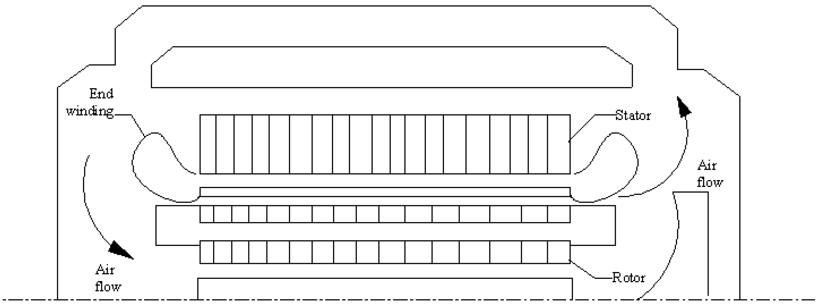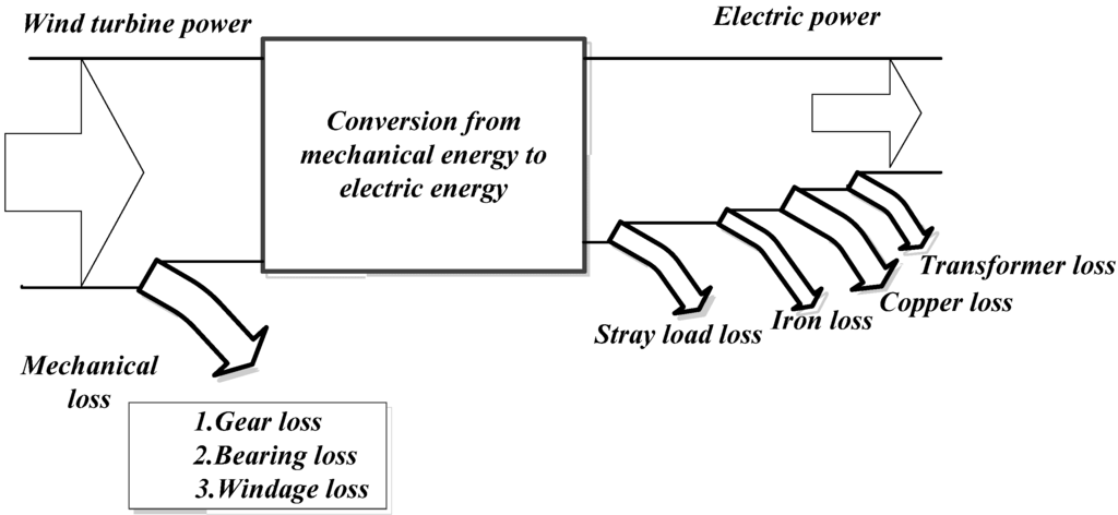 In the power generation process, power losses are dissipated as heat, which directly influences the efficiency of the generator, and the temperature rise due to heat dissipation will further lower the power generator efficiency. In addition, the temperature rise within a generator will accelerate the insulation ageing and therefore affect the life of the generator. The losses related to generator include copper losses, iron losses, mechanical losses and stray losses, which are illustrated in Figure 1 [5]. Internal losses and thermal analysis within the electrical generator is necessary both for proper ventilation design and generator optimization. Copper losses and iron losses are the basic losses for a DFIG stator under normal operation conditions. The stator loss is proportional to the square of the stator current. As for most induction generators, the iron loss is less than the copper loss and it also will not be affected by the load, therefore the iron loss is neglected in many studies [6].