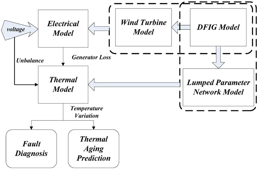 The methodology of electro-thermal analysis of DFIG in a WT is shown in Figure 3. An electrical model is developed based on principle analysis of a wind turbine with DFIG configuration which considers the corresponding control strategy. Failure modes are then introduced into the electrical model to derive the variations of electrical parameters under fault conditions. A power loss mechanism is analyzed for the thermal model. The intrinsic thermal process of the DFIG is analyzed by an LPN model which is actually coupled to the thermal model. The variation of thermal parameters such as temperature rises of different failure modes are quantified by this electro-thermal method for fault diagnosis and thermal ageing prediction.