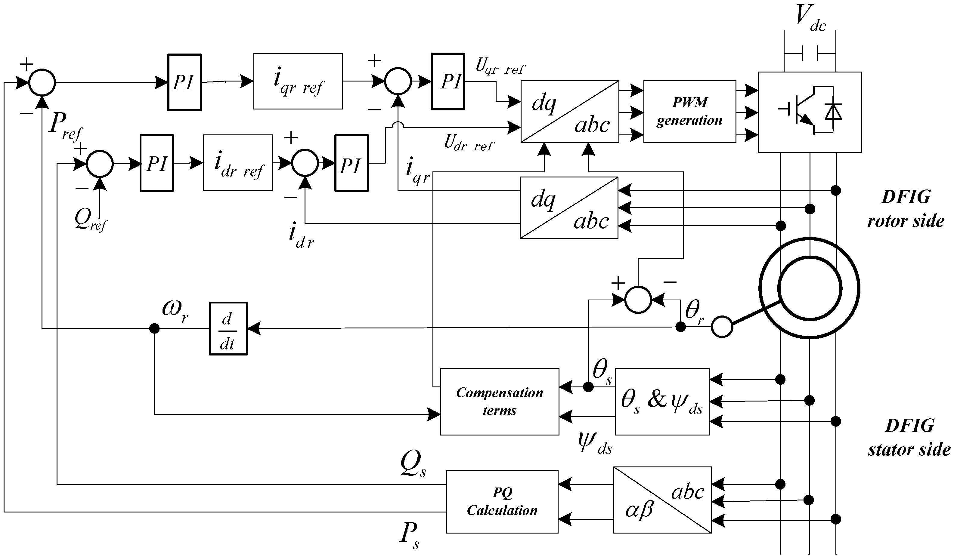 The electromagnetic torque of a DFIG is controlled by the rotor current. For a DFIG rotor associated with a back-to-back converter and with the stator directly connected to the grid, the scheme controls the active and reactive power on the stator side separately. It requires the measurement of stator and rotor currents, stator voltages and rotor phase angles. The control comprises two cascaded loops: the inner loop of reactive power control and the outer loop of active power control. The optimum power is taken as the reference and it is compared with the output active power. The q-axis rotor current is controlled by a PI controller to achieve the reference of active power, which is the same for reactive power via d-axis rotor current control. Both currents are controlled by two subsequent PI controllers to determine corresponding generator rotor voltage, which will be fed back to the DFIG. Therefore, the four PI controllers are used to determine the rotor reference voltages and then the switching signals for IGBTs to produce the required voltages for converter.