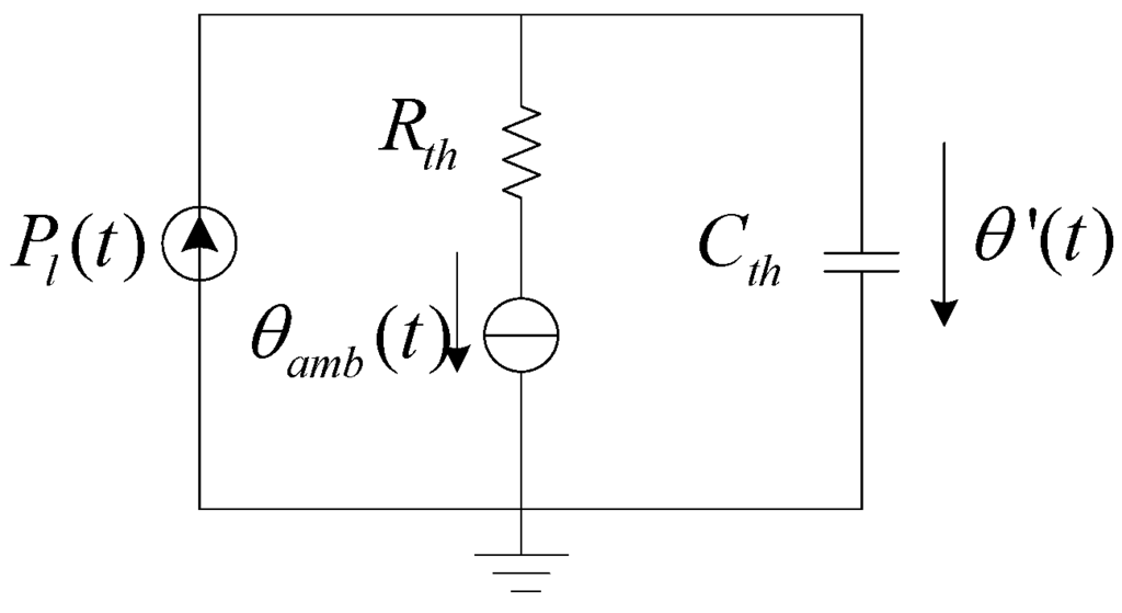 In the LPN model, Rth is the thermal resistance; Cth is the thermal capacitance and θamb(t) is the ambient temperature which represents the environmental variation, and θ’(t) is the generator winding temperature. Thermal resistance Rth is determined jointly by the thermal conduction, convection and radiation resistances. With the equivalent thermal network model established above, the thermodynamics of the stator winding are derived as follows: