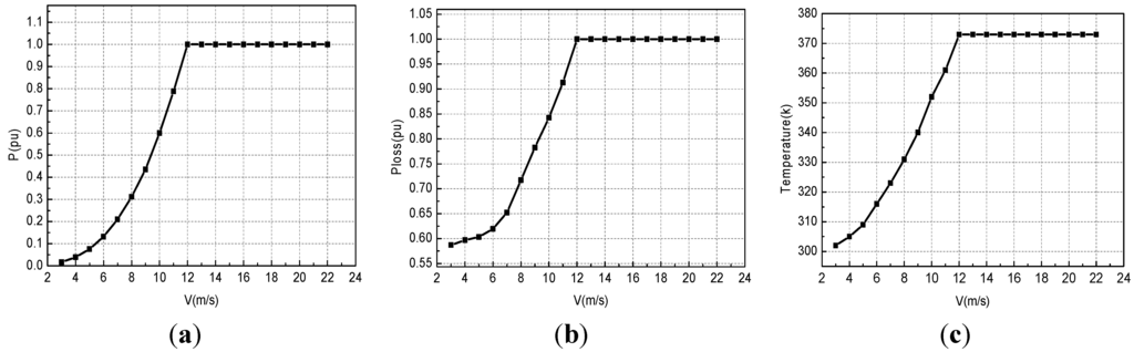 To obtain the generator temperature variation curve, Rth = 1/25K/W, Cth = 4,000 Ws/K, ambient temperature θamb(t) = 20 °C are assumed in the model [14]. The initial winding temperature is set as 0 °C and the simulation period is for 1,400 s. With the parameters above, the normalized power curve of the model WT is shown in Figure 7a. The normalized power loss and absolute stator winding temperature are obtained, and plotted against wind speed (Figure 7b,c). Power losses of the generator and the temperature of stator winding increase with wind speed.