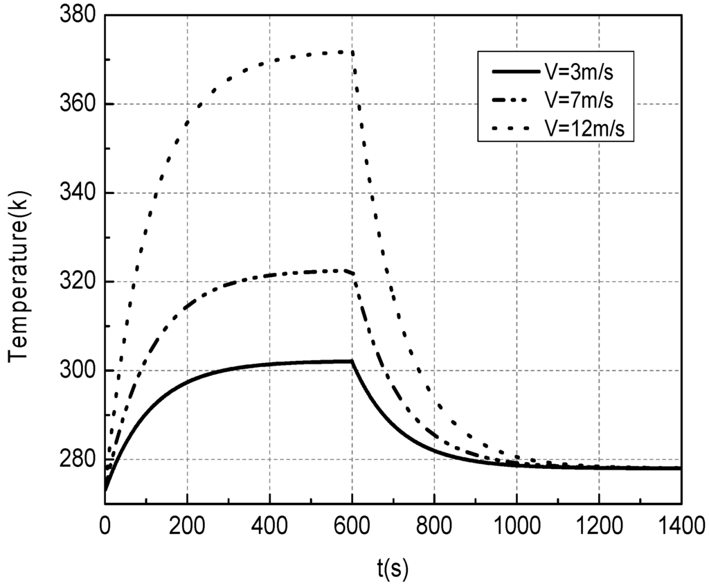 The thermal behavior of the DFIG stator windings under constant wind speeds of 3, 7 and 12 m/s are obtained for a time period of 1,400 s, and shown in Figure 8. In the whole process, the generator ventilation system keeps operating continuously. From the moment that generator starts up, the stator winding experiences the first process of the machine approaching a stable operating condition and the winding reaching a constant temperature, then a second cooling down process after the machine stops at 600 s. At the higher wind speed, e.g., 12 m/s, the stable temperature reaches a higher value around 370 K due to the increase of output power. Although the thermal parameters Rth & Cth determine the time when the stator winding reaches a stable temperature, the wind speed will determine the reachable maximal temperature.