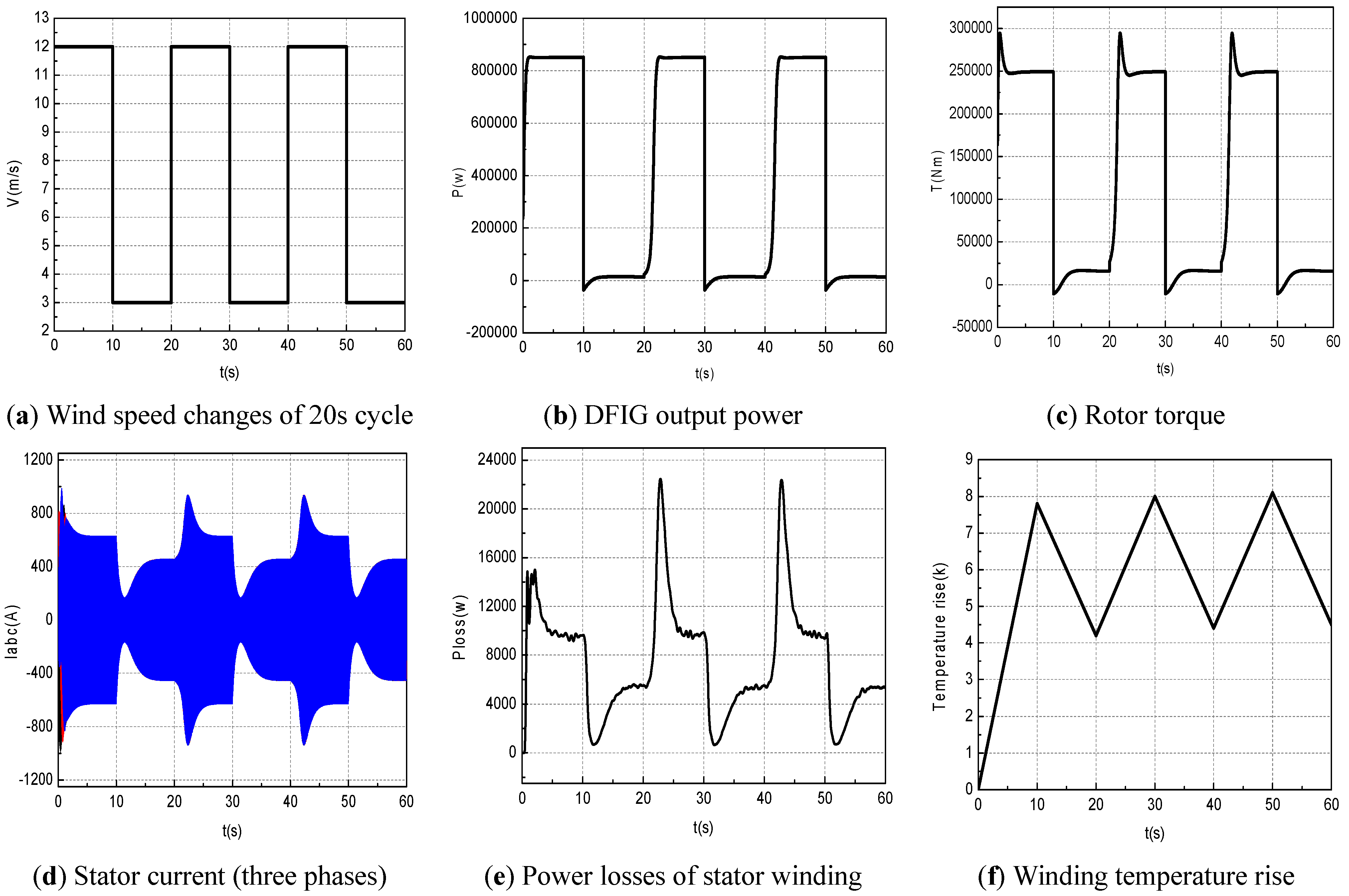 The mechanical, electrical and thermal responses of the DFIG under cyclic wind speed patterns are shown in Figure 9. A sudden rise of wind speed causes sharp increase of power losses, due to the transient current response in the stator winding, as shown in Figure 9d,e. However, the thermal response is not as fast as the electrical response as shown in Figure 9f. This is different from Figure 8, which shows that the stator winding temperature rise is subject to thermal inertia i.e., the temperature of the stator winding takes around 600 s or 10 min to reach its maximum. This is because when the wind speed changes in a step cycle between 3 m/s (i.e., start-up) and 12 m/s (i.e., full power) in just 20 s, as shown in Figure 9a, before the temperature of the stator winding reaches its stabilized value, the wind speed changes cause the temperature to vary, therefore, the temperature rise in the stator winding is between 4 K to 8 K (or °C) above the ambient temperature (i.e., 20 °C or 293 K) as shown in Figure 9f.