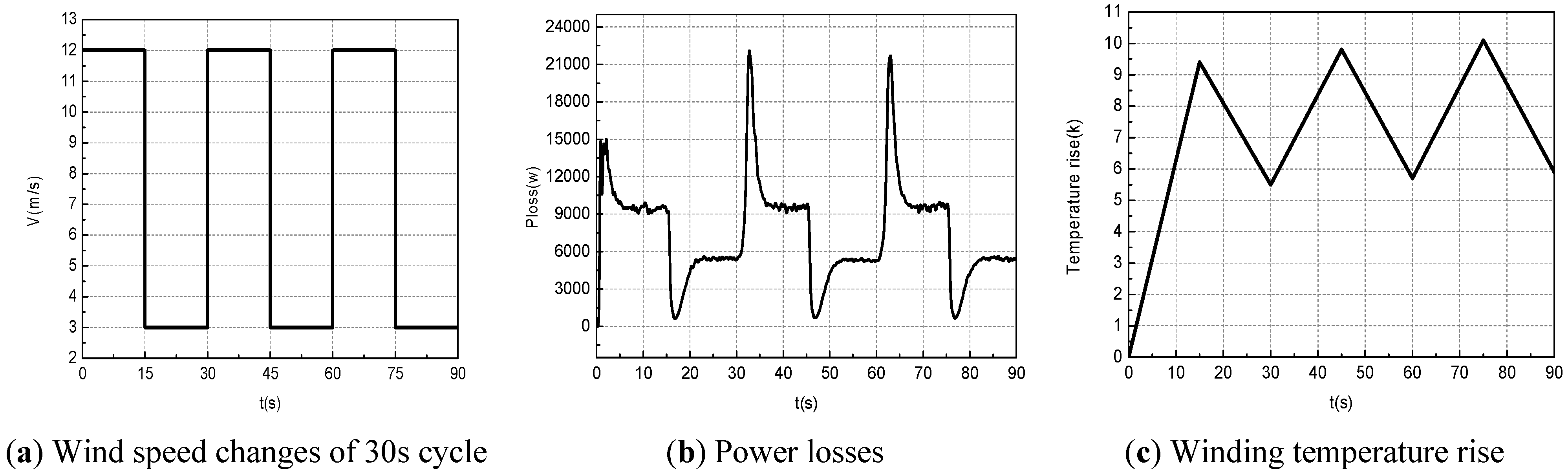 Power losses and temperature rise of stator windings a for wind speed change with a 40 s cycle.