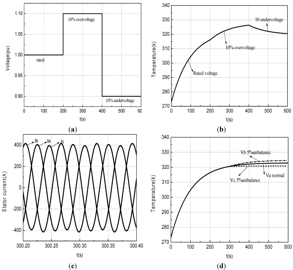 Figure 12a shows a case of 10% PVUR variation for the whole three-phase voltage on a time scale. The generator operates at the rated voltage for the first 200 s, then a 10% overvoltage for the next 200 s, and finally 10% under-voltage for the remaining 200 s. Figure 12b shows the corresponding stator winding temperature changes. Figure 12c shows the stator currents under two-phase (b & c) voltage unbalance with 5% PVUR injected at 300 s. Figure 12d shows a, b & c stator winding temperature changes. During voltage unbalance, the three-phase currents of the DFIG are non-uniform. It is quite clear that the temperature of the windings changes subject to different voltage unbalance situations. There are several causes leading to voltage unbalance such as incomplete transposition of transmission lines, unbalanced loads, open delta transformer connections, blown fuses on three-phase capacitor hanks. Apart from the grid code violation, the voltage unbalance will also have negative impacts on electric machines, such as overheating, current unbalance, de-rating and inefficiency, leading to winding insulation degradation [16].