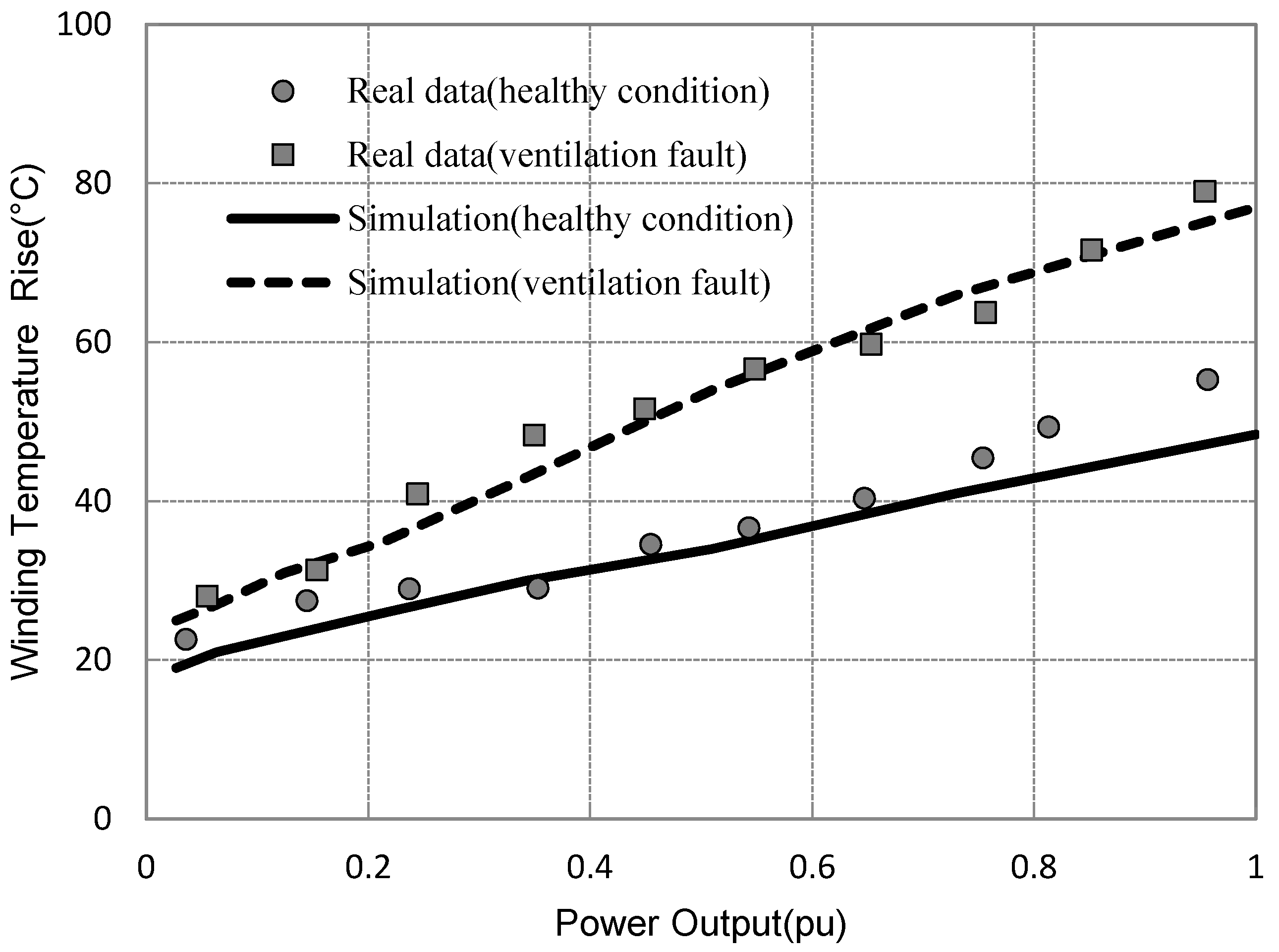 - In the curve of stator winding temperature rise against power output, depending on the specific failure mode, the gradient and intercept of the curve will be different. Simulation clearly demonstrates the physical meanings corresponding to the curve changes, based on which effective fault detection and diagnosis can be easily implemented and interpreted.