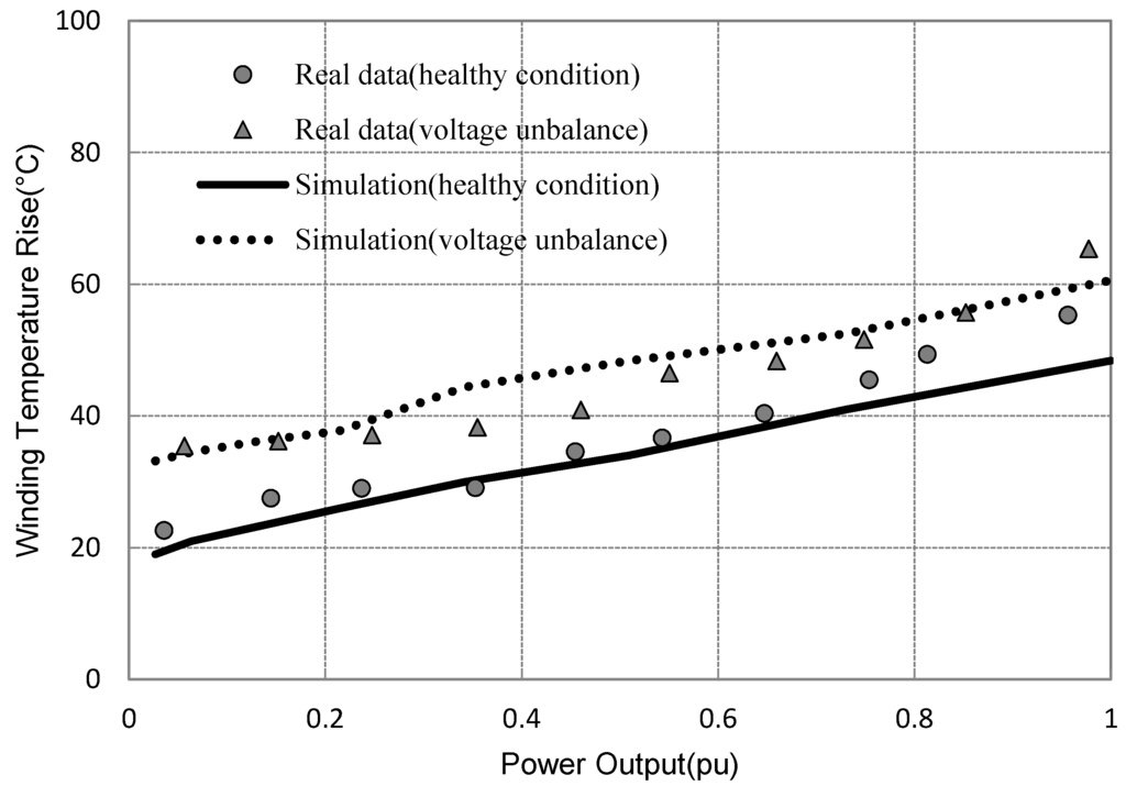 Figure 14 shows the real data of absolute winding temperature rise (K) vs. normalized power output (pu) collected under another two conditions: a DFIG operating under healthy conditions (circles), and a DFIG operating under all three-phase voltage unbalance with 5% overvoltage (triangles). Similarly, the simulated data are further plotted under the same machine conditions, including a DFIG operating under healthy conditions (solid line) and a DFIG operating with a three-phase voltage unbalance with 5% overvoltage (dotted line). After the supply voltage is unbalanced with 5% overvoltage, the line intercept becomes greater, the gradient of stator winding temperature rise against power output remains the same as under healthy conditions.
