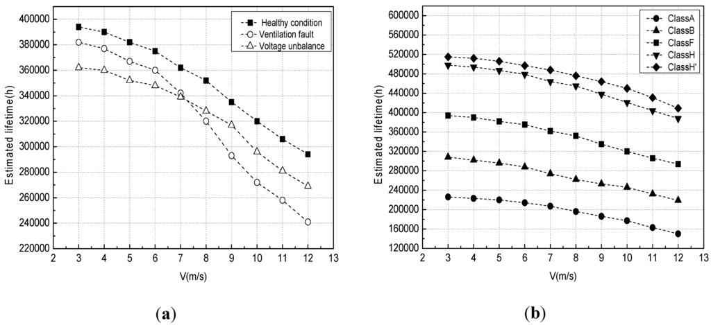 Assuming Class F insulation for a generator stator winding, Figure 15a shows the estimated lifetime of a WT DFIG operating at a certain wind speed. Under healthy operating conditions, the estimated lifetime of the DFIG will be reduced by an increase of wind speed. Figure 15a also shows the estimated lifetime of stator windings subjected to two failure modes, i.e., voltage unbalance with 10% overvoltage and ventilation system failure with thermal resistance increasing by 12.5% and thermal capacitance decreasing by 46.2%. In the higher wind speed range above 7 m/s, ventilation failure has a greater impact on shortening generator lifetime. However, the voltage unbalance has nearly the same effects on shortening generator lifetime at different wind speeds, so the estimated lifetime curve is shifting downwards vertically. Figure 15b shows the estimated lifetimes of stator windings with different Class ratings. To choose an appropriate generator insulation Class, a tradeoff should be made between lifetime design and overall cost.