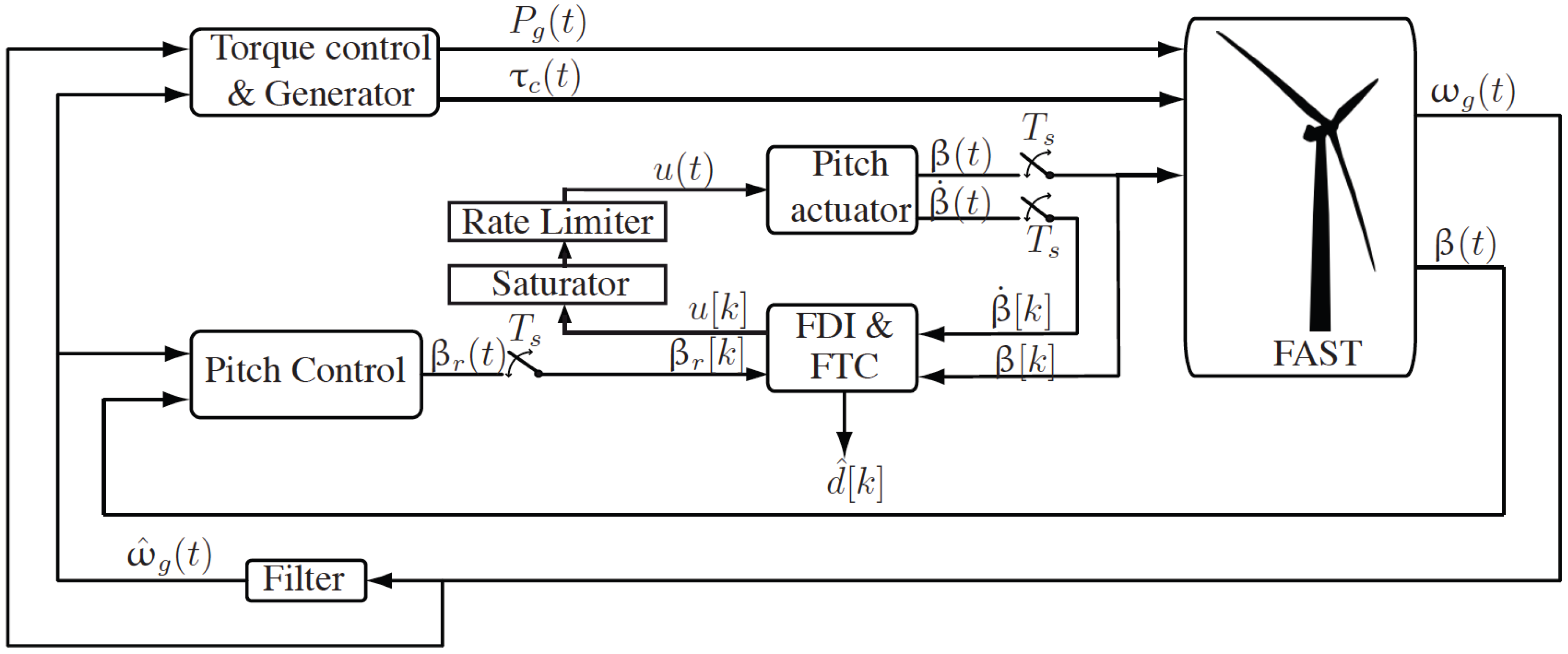This section details the design of the FTC strategy based on a control plus disturbance estimator in the time discrete domain. The control objective is the tracking of the reference signal βr(t) (given by the baseline pitch controller; see Equation (3)) and its corresponding velocity, even in the case of pitch actuator fault. The block diagram in Figure 2 shows the connections between the WT (simulated using FAST), the FTC system, the pitch actuator and the torque and pitch controllers. To discretize continuous signals, a conventional sampler is used. As can be seen in the block diagram in Figure 2, a switch closes to admit an input signal every sampling period Ts. The sampler converts the continuous time signal into a train of pulses occurring at the sampling instants kTs for k = 0, 1, 2, .... Traditionally, a discrete time signal is considered to be undefined at points in time between the sample times. In this work, discrete time signals remain defined between sample times by holding the value at the previous sample time. That is, when the value of a discrete signal is measured between sample times, the value of the signal at the previous sample time is observed. This is known as a zero-order hold or the staircase generator, as the output of a zero-order hold is a staircase function. In this paper, the notation [k] is used for these discrete time signals.