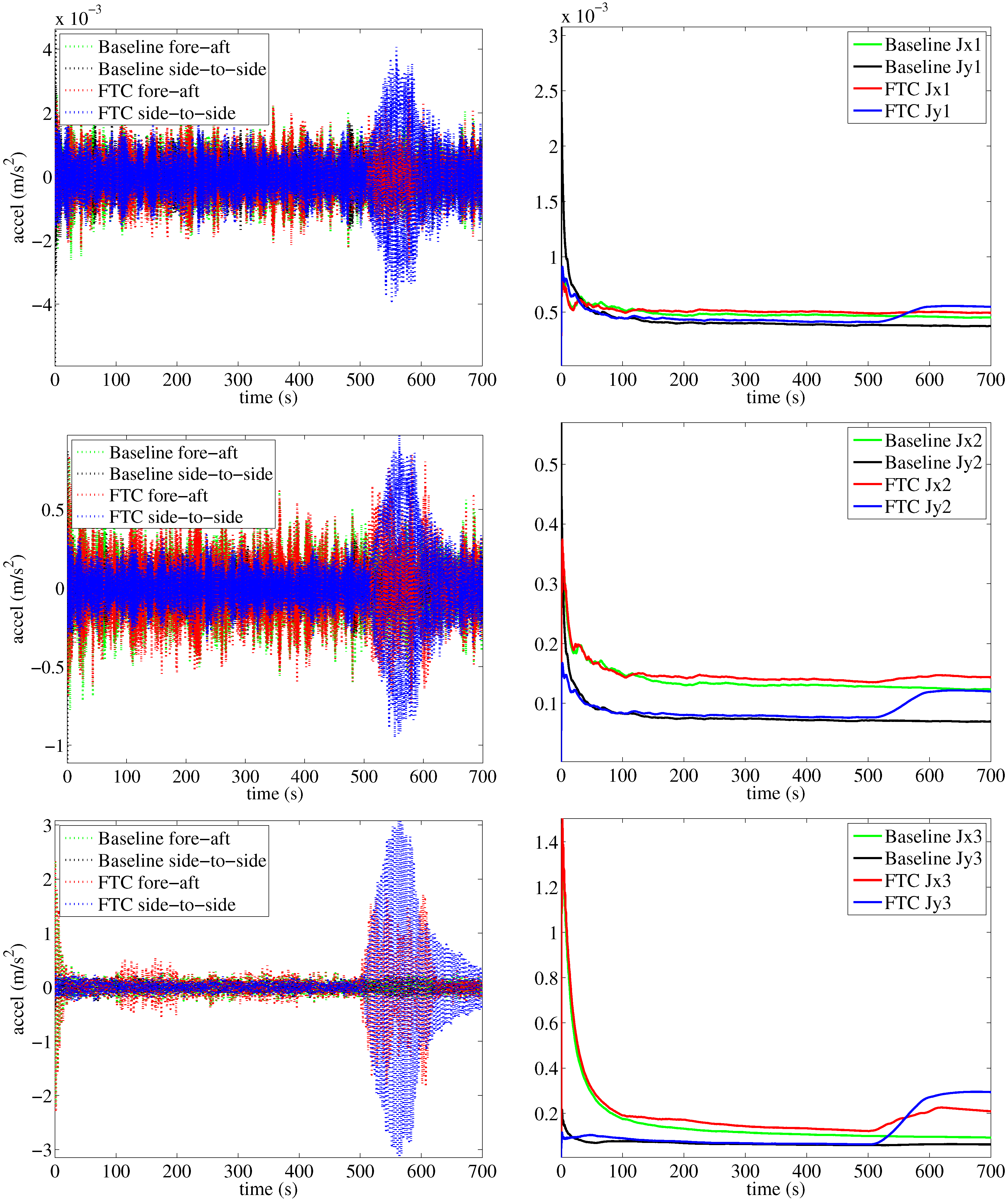 As can be seen in Figure 8, the fore-aft and side-to-side accelerations are similar for the FTC technique (with faults) and for the fault-free baseline control strategy. The performance indices Jxi(t) and Jyi(t) at different tower heights corroborate this statement, as their values are similar for the FTC and the baseline control strategy.