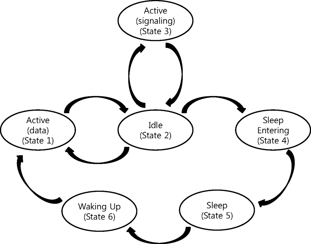After completing service either in the active (data) state and active (signaling) state, the state returns to the idle state, and an inactivity timer is started. If there are no data or signaling transmission until the inactivity timer expires, the state moves to the sleep entering state, and the BSs start to turn off their radio interface and prepare to enter the sleep state. Otherwise, the inactivity timer is reset, and the state returns back to either the active (data) or active (signaling) state, depending on the type of activity, i.e., data or signaling transmission. That is, if data arrive, the state moves to the active (data) state. On the other hand, if signaling arrives, the state moves to the active (signaling) state.