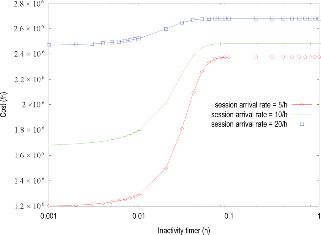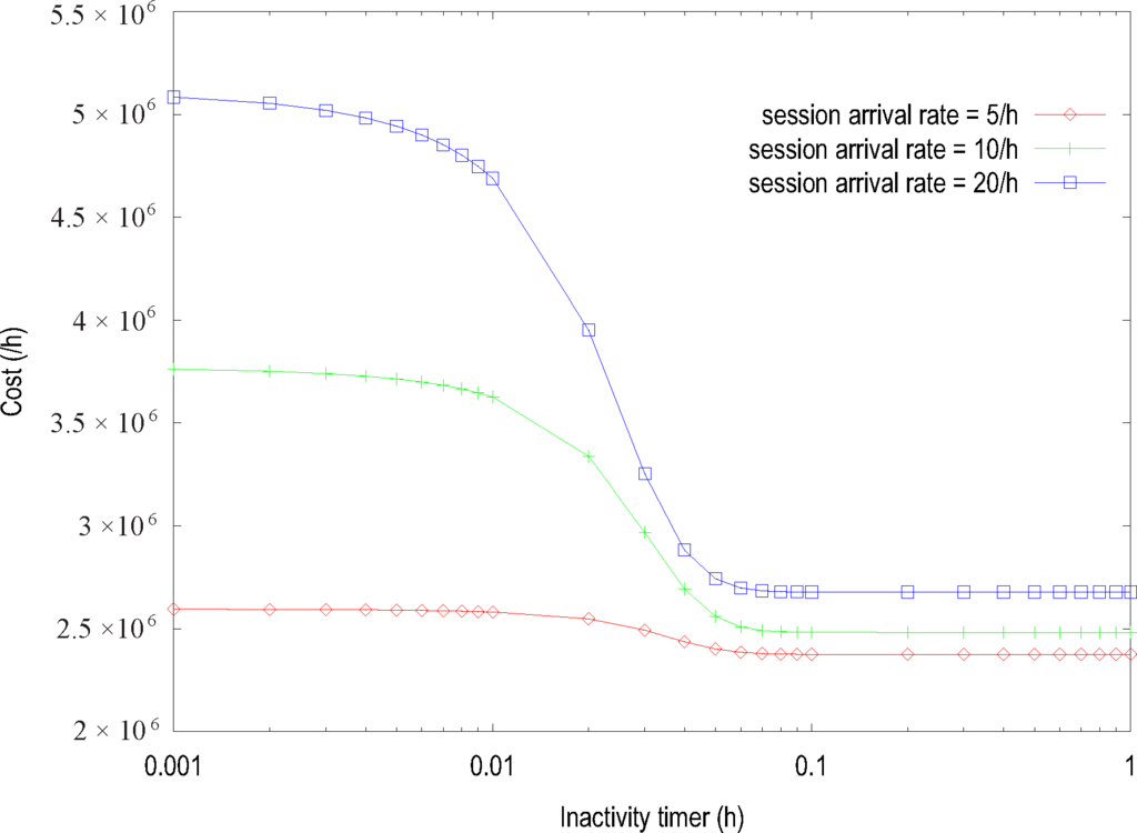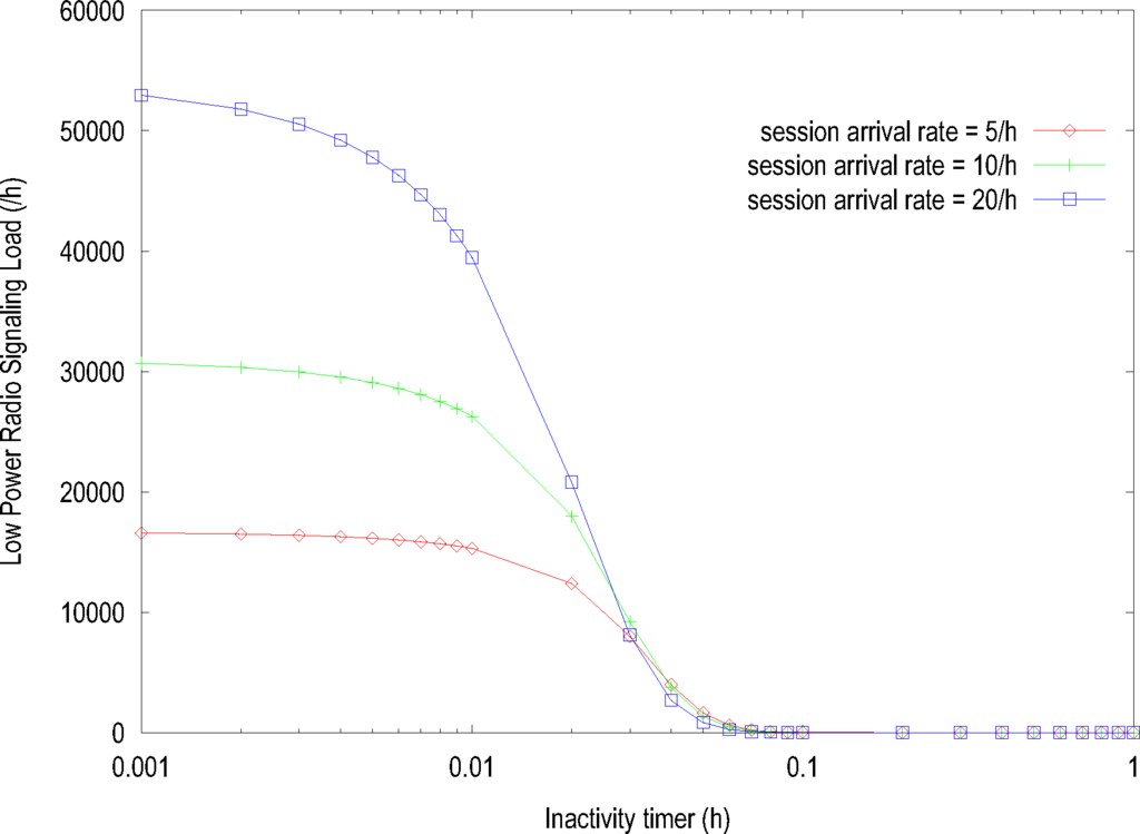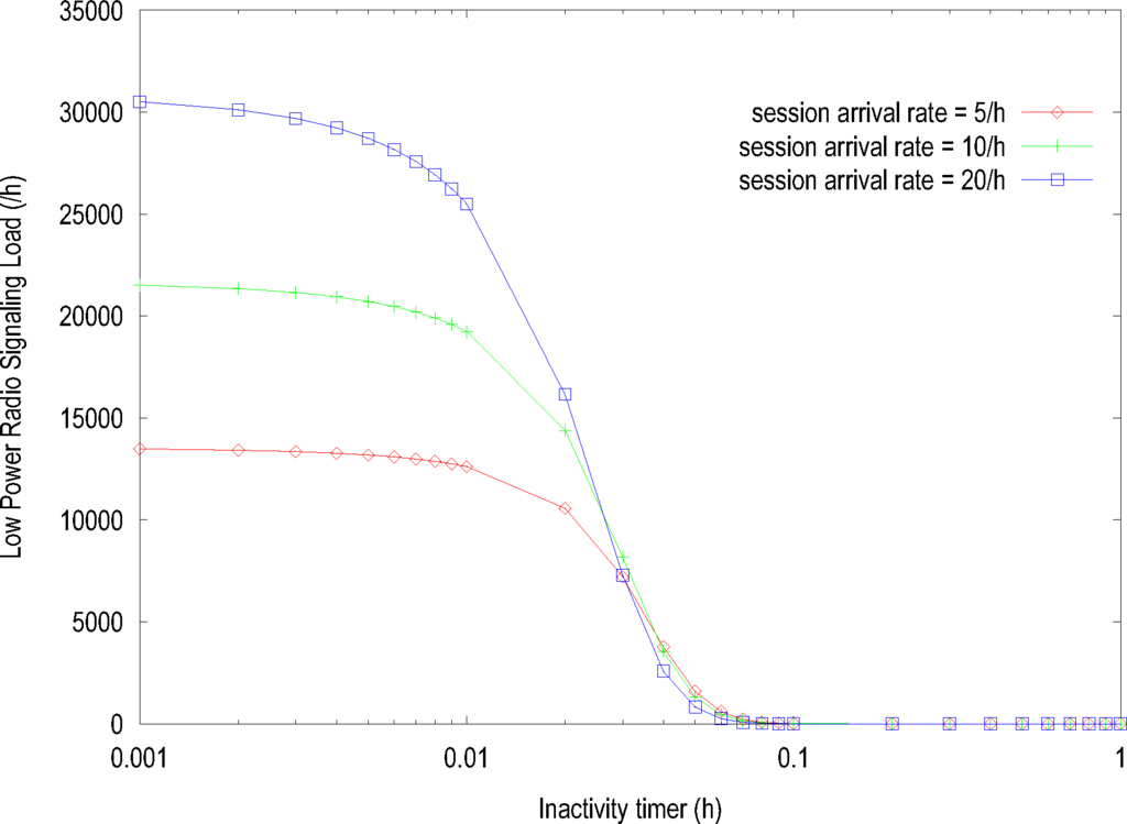 Low-power radio signaling load by varying the session arrival rate (small values of TE and TW).