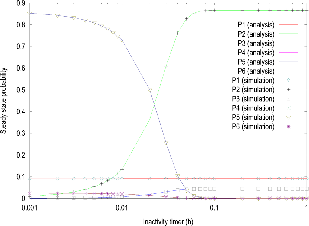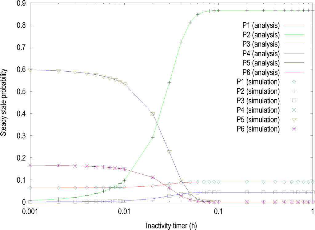 Figure 2 shows the steady-state probability of the femto BS state by varying the values of inactivity timer TI with λs = 10 (/h), μs = 100 (/h), λr = 100 (/h), μr = 2000 (/h), ψ1 = 12 W, ψ2 = 6 W, ψ3 = 12 W, ψ4 = 24 W, ψ5 = 1.2 W, ψ6 = 24 W, TE = 10/3600 (h) and TW = 10/3600 (h). The figure shows both analysis and simulation results, and we can see that the analysis result is validated by simulation results. The probability of the idle state increases as the values of the inactivity timer increase due to less transitions into the sleep state. On the other hand, the probability of the sleep state decreases as the values of the inactivity timer increase. Furthermore, the probability of active is almost constant and does not highly depend on the values of the inactivity timer, since transition into the active state occurs from both idle and sleep states, which have the opposite probability distributions. The probability of the active (signaling) state increases as the values of the inactivity timer increase, similar to that of the idle state, since the transition into the active (signaling) state occurs from the idle state. The probabilities of sleep entering and waking up are the same and decrease as the values of the inactivity timer increases, similar to that of the sleep state, but they have much smaller probability values. From the results, we can see that the value of the inactivity timer has a significant effect on the steady-state probability of the femto BS state.