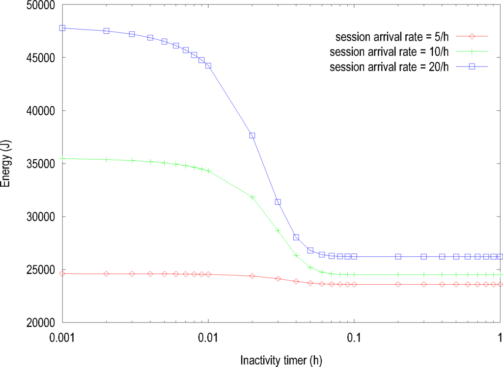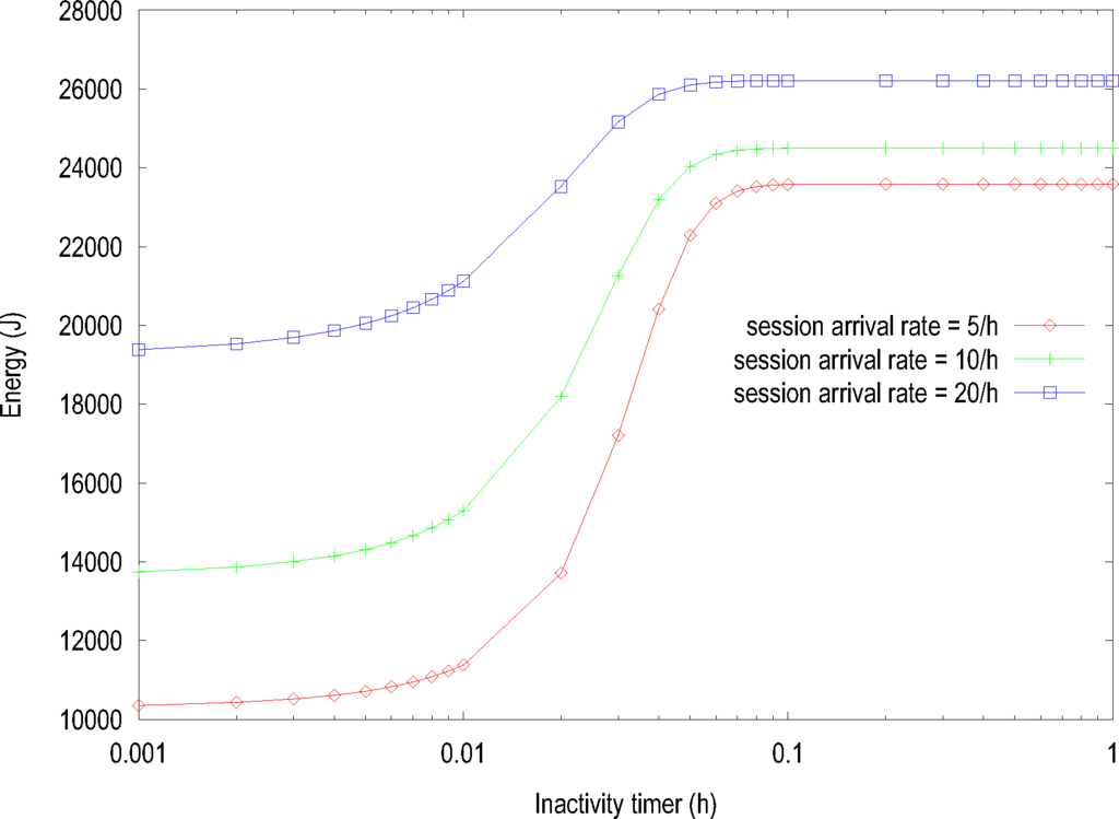 Figure 4 and Figure 5 show the energy consumption by varying the values of the inactivity timer TI and the rate of data session arrival λr, with the same parameter settings as those of Figure 2 and Figure 3, respectively. The energy consumption of Figure 4 increases as the values of the inactivity timer increase, since the probability of the idle state increases, which has a higher power consumption than the sleep state, and the effects of energy consumptions of the sleep entering and waking up states are not significant due to the small mean residence times, i.e., steady-state probabilities, of these states. On the other hand, the energy consumption of Figure 5 decreases as the values of the inactivity timer increase, since the effects of energy consumptions of the sleep entering and waking up states are significant due to the increased mean residence times, i.e., steady-state probabilities, of these states, although the probability of the idle state increases, similar to Figure 4. These results show that different inactivity timer values should be selected appropriately to reduce energy consumptions depending on the effect of the energy consumptions of the sleep entering and waking up states. For a fixed value of the inactivity timer, the energy consumption increases as the rate of session arrival increases, in both Figure 4 and Figure 5, since higher data session arrivals cause more transitions into the active (data) state. From the results, we can see that an appropriate value for the inactivity timer should be selected to reduce energy consumption, depending on the energy consumption in the sleep entering and waking up states.