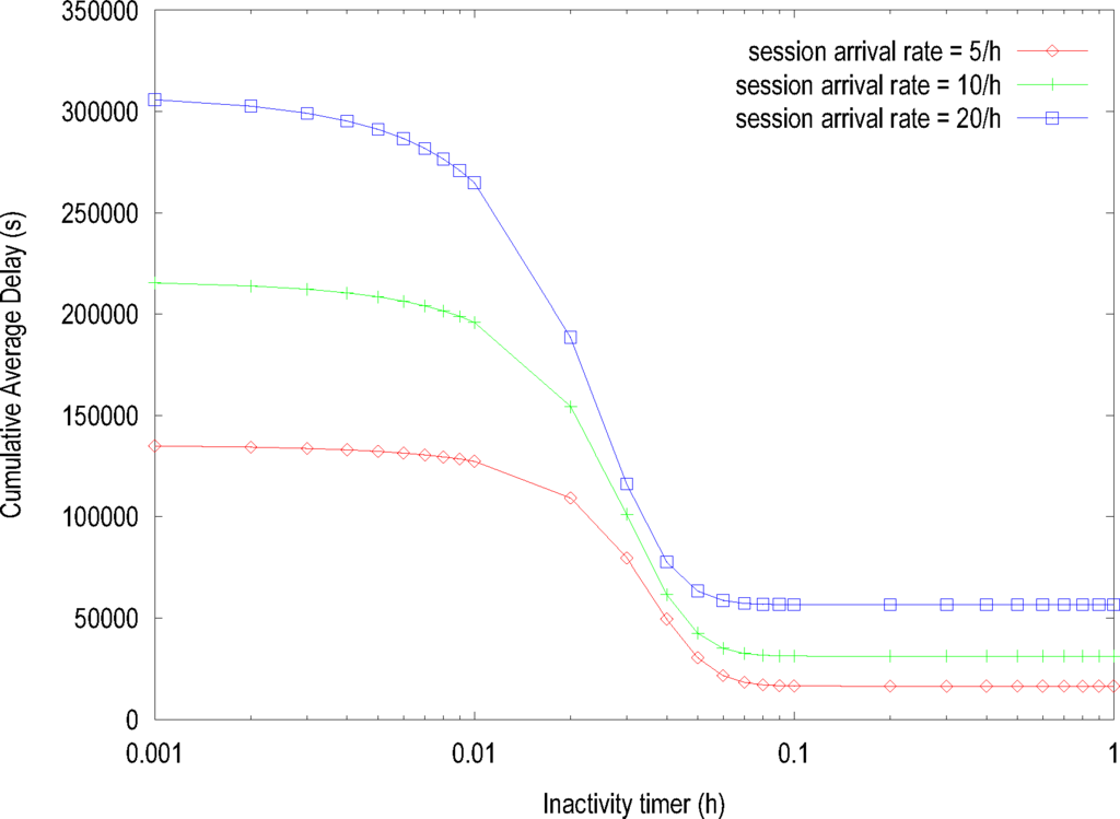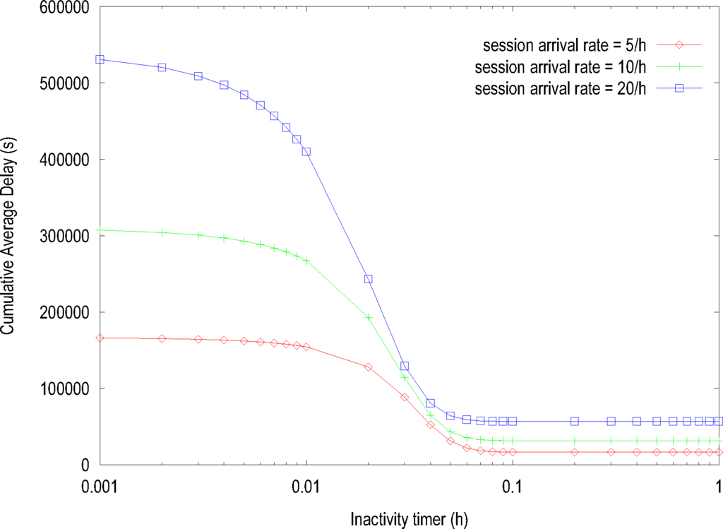 Figure 6 and Figure 7 show the cumulative average delay by varying the values of the inactivity timer TI and the rate of data session arrival λr, with the same parameter settings as those of Figure 2 and Figure 3, respectively, except for Doff = 10(s) and Don = 1(s). The shapes of the cumulative average delay in Figure 6 and Figure 7 are very similar to each other, but the delay in Figure 6 has higher values, since the probability of the sleep state is higher in Figure 6. The cumulative average delay decreases as the values of the inactivity timer increase, since the probability of the idle state increases, which has a smaller delay than the sleep state. For a fixed value of the inactivity timer, the cumulative average delay increases as the rate of data session arrival increases. For small values of the inactivity timer, the effect of long delay in the sleep state is more dominant. Otherwise, the effect of short delay in the idle state is more dominant.