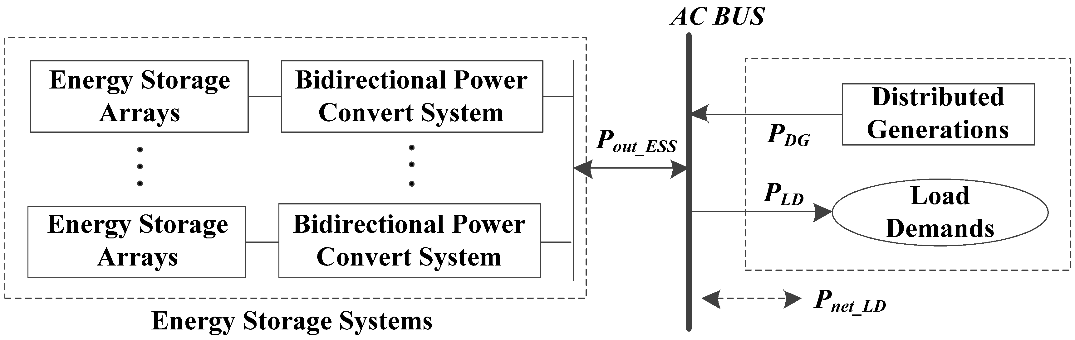The load demands are the requirement of time-varying power from AC BUS to the load shown as PLD in Figure 1. PDG shown in Figure 1 is the sum of output powers of distributed generation sent to the AC BUS. The distributed generation consists of renewable energy generation sources, such as WT, PV and so on, which should be utilized as much as possible. The distributed generation sources can’t maintain the system stability and power balance because their output powers are random, intermittent and uncontrollable. The balance node is ESSs which can absorb and output power satisfying the system requirement within the allowable range. HESS or SESS consisting of energy-type ESS can be used here. Pout_ESS shown in Figure 1 is the total charge-discharge power of ESSs, i.e., the bi-directional power flow between ESSs and the AC BUS. At the same time, the sum of load demands and distributed generations can be regarded as the net load of this system Pnet_LD shown in Figure 1. If the direction to AC BUS is defined as the positive direction, the values of PLD and PDG are negative and positive, respectively, and the values of Pout_ESS and Pnet_LD both can be positive or negative.