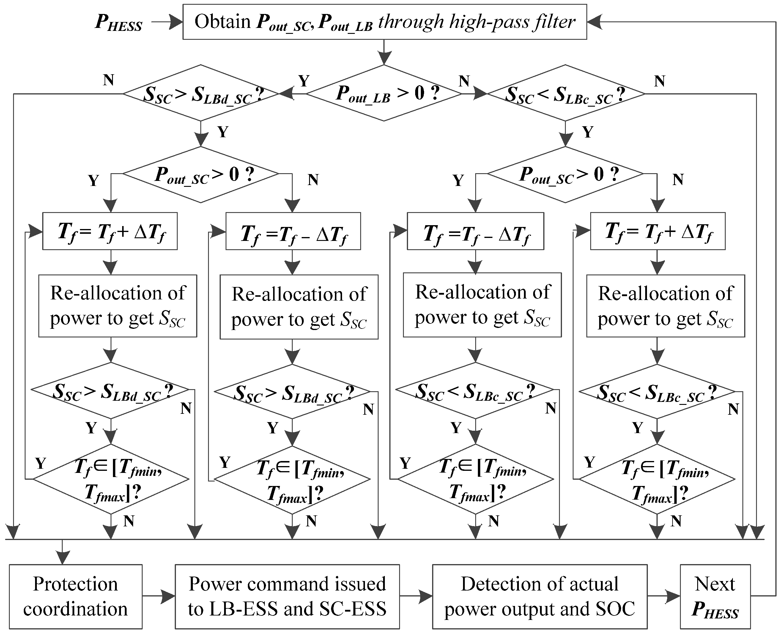 The computation of primary allocation is same as Equations (9) and (10), where Tf is the initial value Tf0. When optimizing the overall adjustment ability, Tf can be repeatedly adjusted within the permissible range [Tfmin, Tfmax] in steps of ΔTf. Figure 3 illustrates the principle of overall adjustment ability optimization as the core part of the coordinated control strategy, where SOC of SC-ESS is dynamically adjusted according to charge-discharge status of LB-ESS [32]. It shows that charging margin is reserved in SC-ESS when LB-ESS is discharging, and discharging margin is reserved in SC-ESS when LB-ESS is charging. Then there will be an enhanced response capability for instantaneous power changes, an optimization of charge and discharge process for SC-ESS, and an improvement of overall performance for HESS. Hence, a new index named as SOC coordinated response margin of SC-ESS is denoted by ΔSco_SC, which is numerically equal to (Smax_SC -SLBd_SC) or (SLBc_SC -Smin_SC).