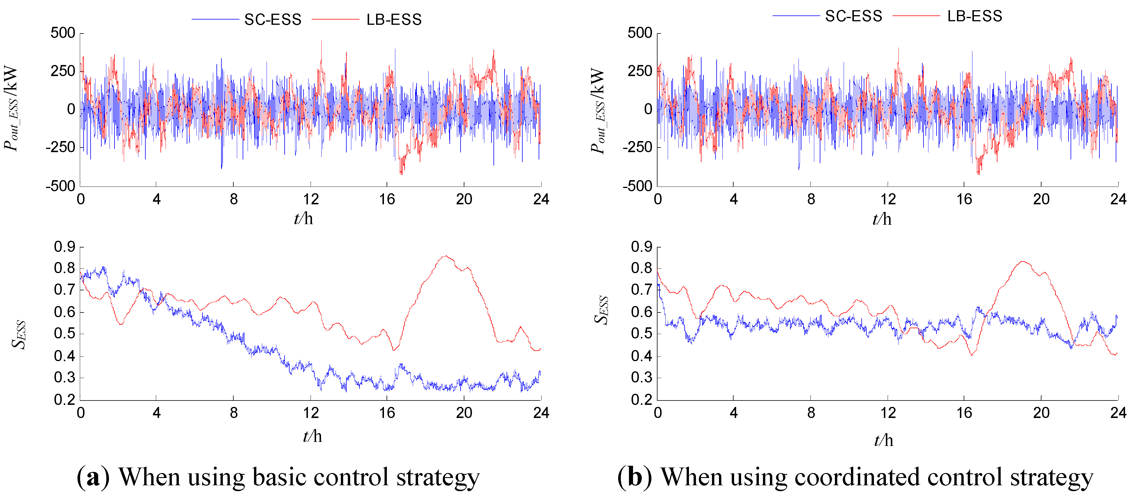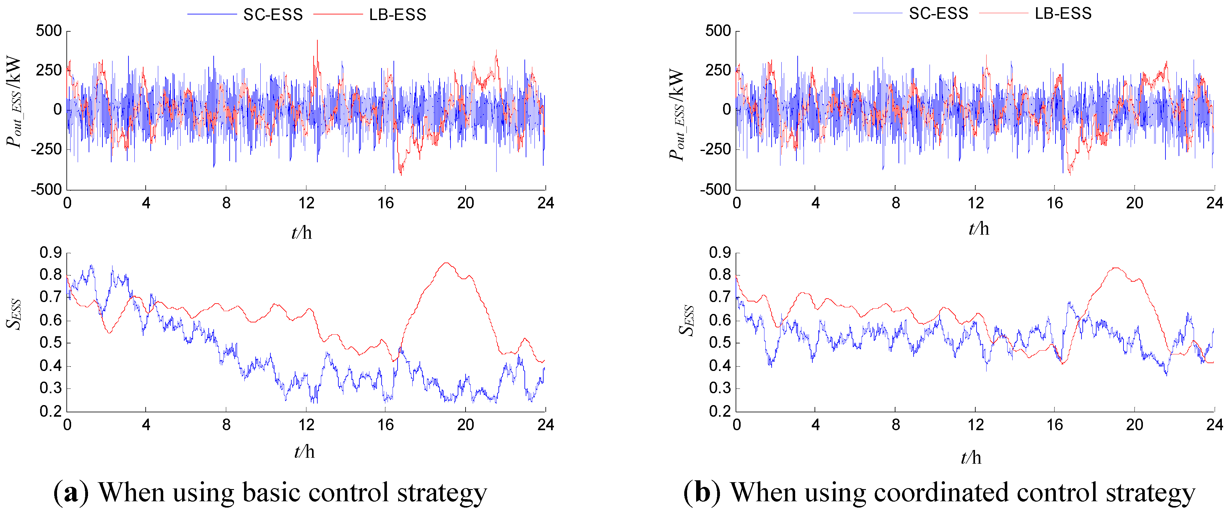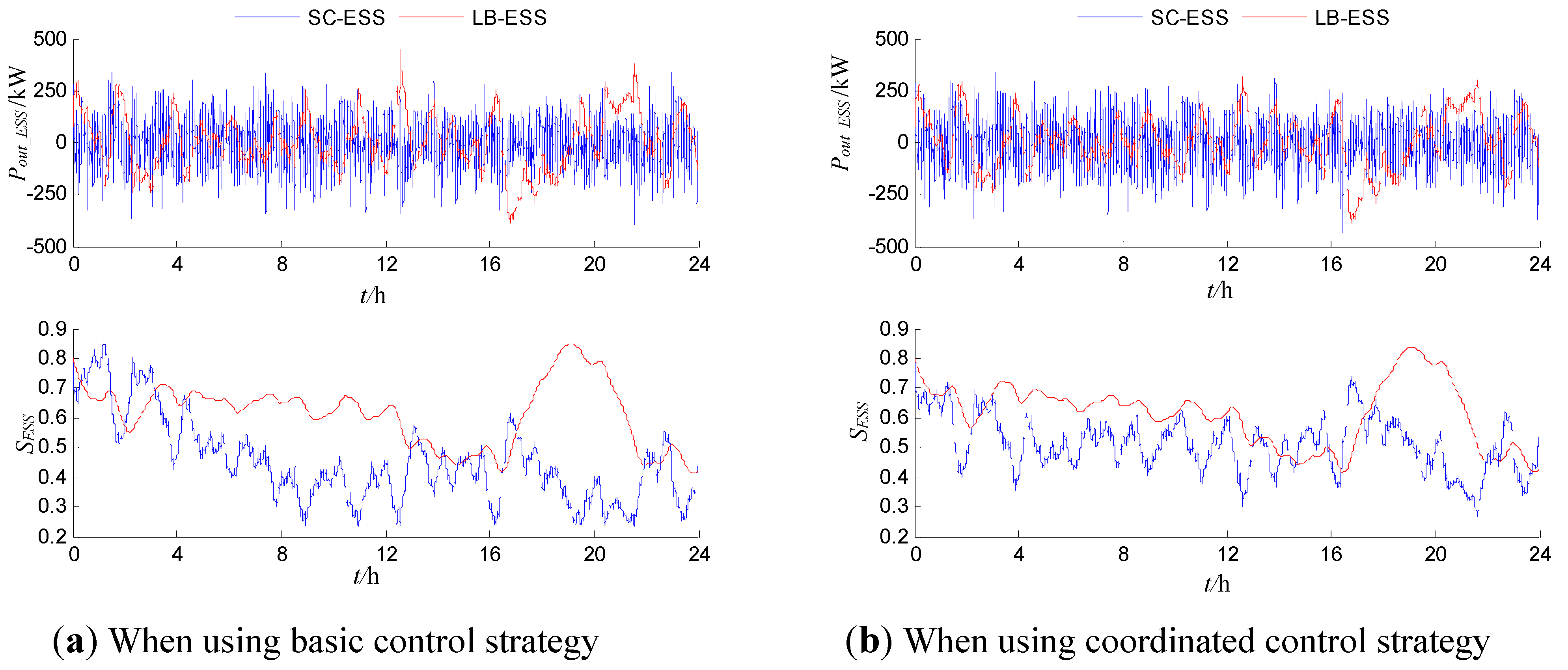 A case is presented to analyze the difference between the basic control strategy and the coordinated control strategy. Through the comparison of HESS operation under different control strategies, the strategy which will be used for further research can be determined. The operation of HESS using two strategies to satisfy the net load shown in Figure 4 should be compared through the case study. In order to maintain comparability, i.e., the effectiveness of comparative analysis results for different control strategies, the constraint of ESS effective rate should always be fully met. Therefore, HESS should have a redundant configuration based on net load demand. Combined with analysis of Figure 4, the rated output power and rated storage capacity of LB-ESS and SC-ESS are set as 500 kW/1,000 kWh and 500 kW/10 kWh, respectively.
